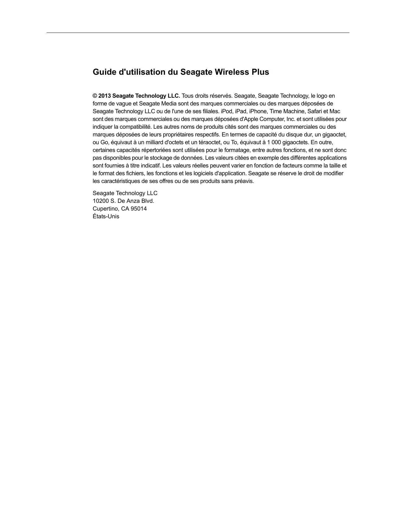 © 2013 Seagate Technology LLC. Tous droits réservés. Seagate, Seagate Technology, le logo en forme de vague et Seagate Media sont des marques commerciales ou des marques déposées de Seagate Technology LLC ou de l'une de ses filiales. iPod, iPad, iPhone, Time Machine, Safari et Mac sont des marques commerciales ou des marques déposées d'Apple Computer, Inc. et sont utilisées pour indiquer la compatibilité. Les autres noms de produits cités sont des marques commerciales ou des marques déposées de leurs propriétaires respectifs. En termes de capacité du disque dur, un gigaoctet, ou Go, équivaut à un milliard d'octets et un teraoctet, ou To, équivaut à 1 000 gigaoctets. En outre, certaines capacités répertoriées sont utilisées pour le formatage, entre autres fonctions, et ne sont donc pas disponibles pour le stockage de données. Les valeurs citées en exemple des différentes applications sont fournies à titre indicatif. Les valeurs réelles peuvent varier en fonction de facteurs comme la taille et le format des fichiers, les fonctions et les logiciels d'application. Seagate se réserve le droit de modifier les caractéristiques de ses offres ou de ses produits sans préavis.