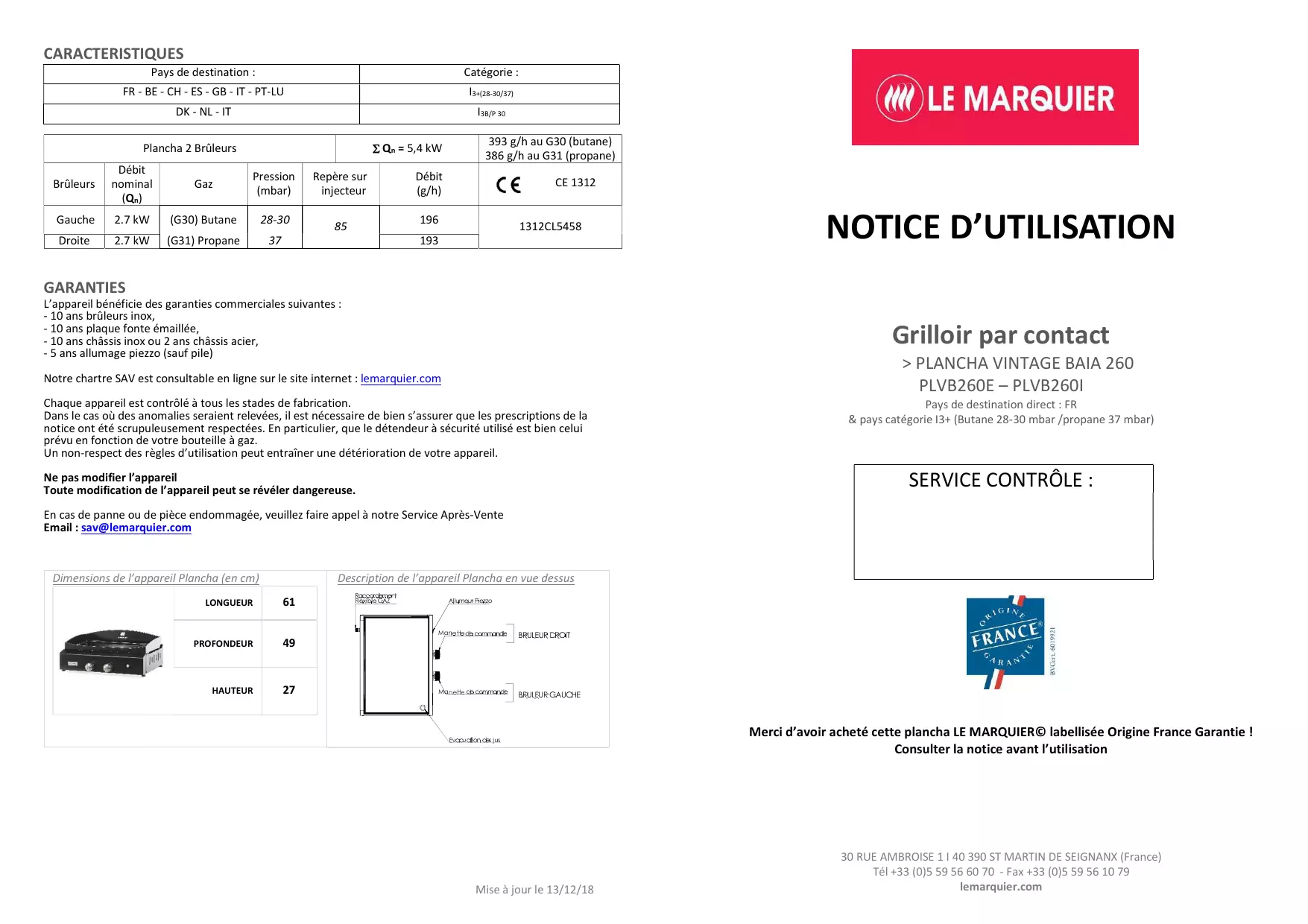 Merci d'avoir acheté cette plancha LE MARQUIER© labellisée Origine France Garantie! Consultez la notice avant l'utilisation.