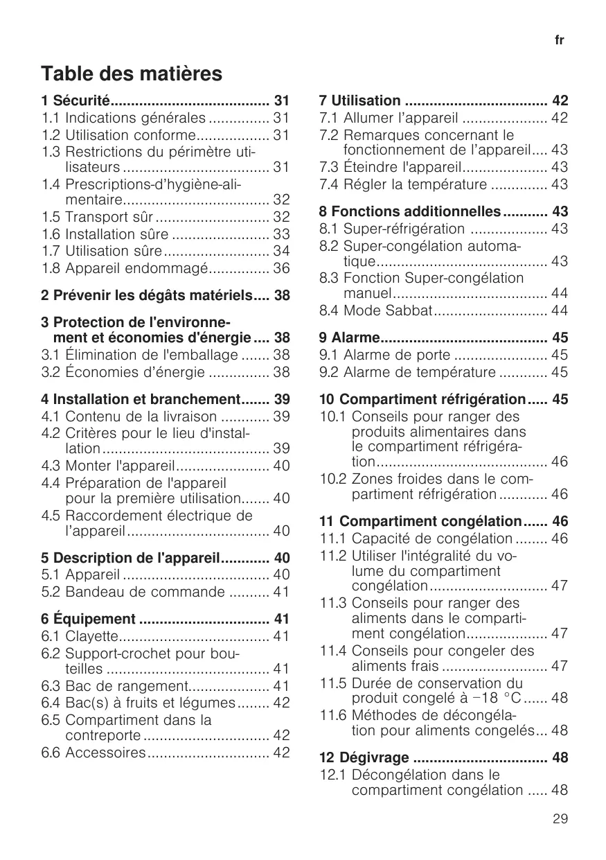 11.2 Utiliser l'intégralité du volume du compartiment congélation 47 11.3 Conseils pour ranger des aliments dans le compartiment congélation 47 11.4 Conseils pour congeler des aliments frais 47 11.5 Durée de conservation du produit congelé à −18 °C 48 11.6 Méthodes de décongélation pour aliments congelés... 48 12 Dégivrage 48 12.1 Décongélation dans le compartiment congélation 48 29