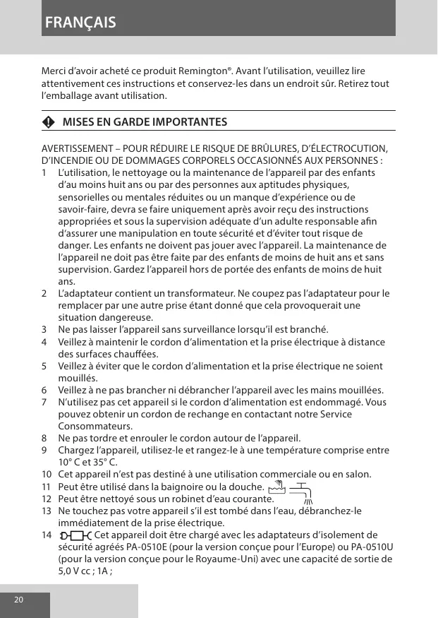 1 L'utilisation, le nettoyage ou la maintenance de l'appareil par des enfants d'au moins huit ans ou par des personnes aux aptitudes physiques, sensorielles ou mentales réduites ou un manque d'expérience ou de savoir-faire, devra se faire uniquement après avoir reçu des instructions appropriées et sous la supervision ajustée d'un adulte responsable afin d'assurer une manipulation en toute sécurité et d'éviter tout risque de danger. Les enfants ne doivent pas jouer avec l'appareil. La maintenance de l'appareil ne doit pas être faite par des enfants de moins de huit ans et sans supervision. Gardez l'appareil hors de portée des enfants de moins huit ans. 2 L'adaptateur contient un transformateur. Ne coupez pas l'adaptateur pour le remplacer par une autre prise étant donné que cela provoquerait une situation dangereuse. 3 Ne pas laisser l'appareil sans surveillance lorsqu'il est branché. 4 Veillez à prendre le cordon d'alimentation et la prise électrique à distance des surfaces chauffées. 5 Veillez à éviter que le cordon d'alimentation et la prise électrique ne soient mouillés. 6 Veillez à ne pas brancher ni débrancher l'appareil avec les mains mouillées. 7 N'utilisez pas cet appareil si le cordon d'alimentation est endommagé. Vous pouvez obtenir un cordon de rechange en contactant notre Service Consommateurs. 8 Ne pas tordre et enrouler le cordon autour de l'appareil. 9 Chargez l'appareil, utilisez-le et rangez-le à une température comprise entre 10°C et 35°C. 10 Cet appareil n'est pas destiné à une utilisation commerciale ou en salon. 11 Peut être utilisé dans la baignoire ou la douche. 12 Peut être nettoyé sous un robinet d'eau courante. 13 Ne touchez pas votre appareil s'il est tombé dans l'eau, débranchez-le immédiatement de la prise électrique. 14 Cet appareil doit être chargé avec les adaptateurs d'isolement de sécurité agréés PA-0510E (pour la version conçue pour l'Europe) ou PA-0510U (pour la version conçue pour le Royaume-Uni) avec une capacité de sortie de 5,0 V cc; 1A;