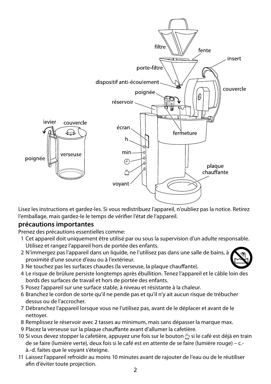 1 Cet appareil doit uniquement être utilisé par ou sous la supervision d'un adulte responsable. Utilisez et rangez l'appareil hors de portée des enfants. 2 N'immergez pas l'appareil dans un liquide, ne l'utilisez pas dans une salle de bains, à proximité d'une source d'eau ou à l'extérieur. 3 Ne touchez pas les surfaces chaudes (la verseuse, la plaque chauffante). 4 Le risque de brûlure persiste longtemps après ébullition. Tenez l'appareil et le câble loin des bords des surfaces de travail et hors de portée des enfants. 5 Posez l'appareil sur une surface stable, à niveau et résistante à la chaleur. 6 Branchez le cordon de sorte qu'il ne pende pas et qu'il n'y ait aucun risque de trébucher dessus ou de l'accrocher. 7 Débranchez l'appareil lorsque vous ne l'utilisez pas, avant de le déplacer et avant de le nettoyer. 8 Remplissez le réservoir avec 2 tasses au minimum, mais sans dépasser la marque max. 9 Placez la verseuse sur la plaque chauffante avant d'allumer la cafetière. 10 Si vous devez stopper la cafetière, appuyez une fois sur le bouton si le café est déjà en train de se faire (lumière verte), deux fois si le café est en attente de se faire (lumière rouge) - c.-a.-d. faites que le voyant s'éteigne. 11 Laissez l'appareil refroidir au moins 10 minutes avant de rajouter de l'eau ou de le réutiliser afin d'éviter toute projection.