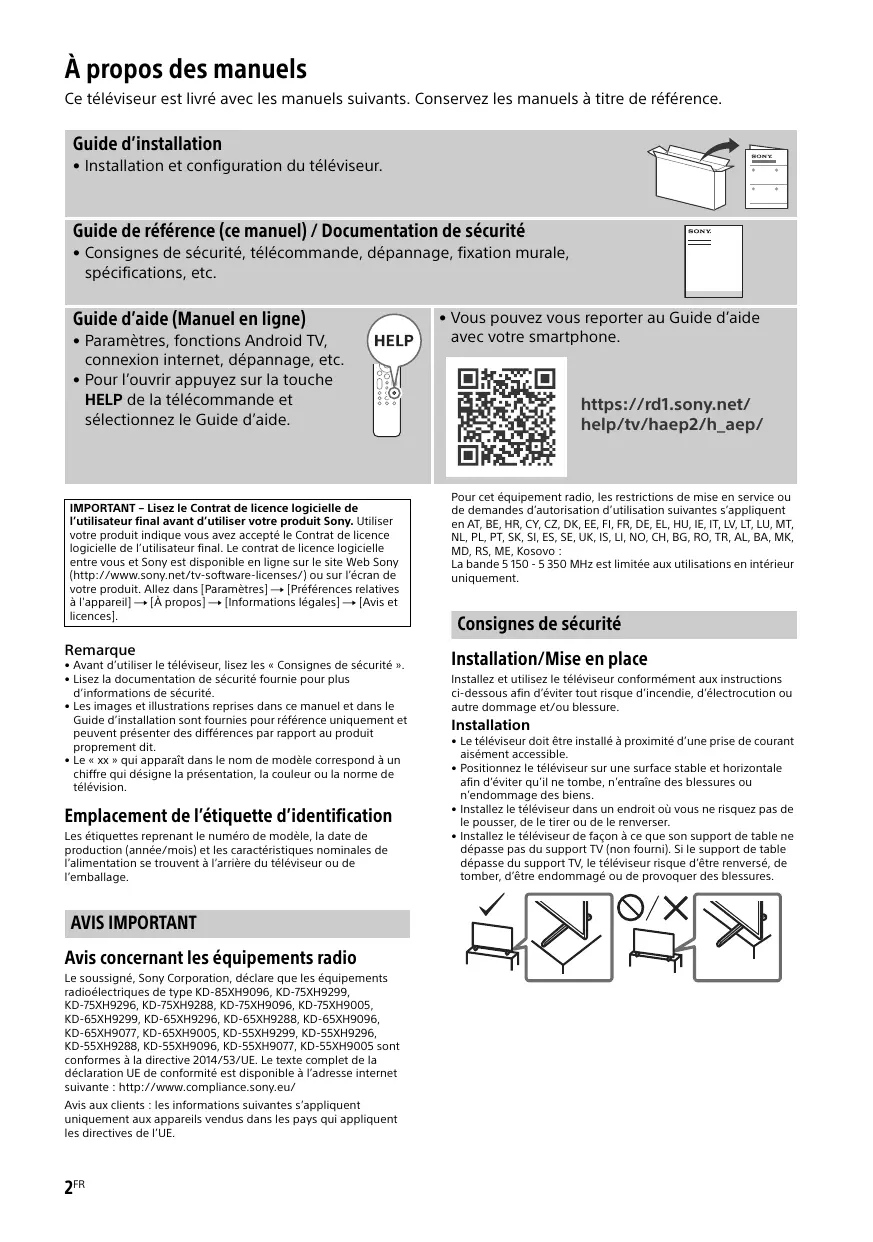 - Le « xx » qui apparaît dans le nom de modèle correspond à un chiffre qui désigne la présentation, la couleur ou la norme de télévision. Emplacement de l’étiquette d’identification Les étiquettes reprenant le numéro de modèle, la date de production (année/mois) et les caractéristiques nominales de l’alimentation se trouvent à l’arrière du téléviseur ou de l’emballage. AVIS IMPORTANT Avis concernant les équipements radio Le soussigné, Sony Corporation, déclare que les équipements radioélectriques de type KD-85XH9096, KD-75XH9299, KD-75XH9296, KD-75XH9288, KD-75XH9096, KD-75XH9005, KD-65XH9299, KD-65XH9296, KD-65XH9288, KD-65XH9096, KD-65XH9077, KD-65XH9005, KD-55XH9299, KD-55XH9296, KD-55XH9288, KD-55XH9096, KD-55XH9077, KD-55XH9005 sont conformes à la directive 2014/53/UE. Le texte complet de la déclaration UE de conformité est disponible à l’adresse internet suivante : http://www.compliance.sony.eu/ Avis aux clients : les informations suivantes s’appliquent uniquement aux appareils vendus dans les pays qui appliquent les directives de l’UE. 2FR