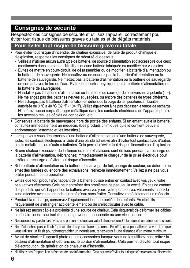 - Pour éviter tout risque d’incendie, de chaleur excessive, de fuite de produit chimique et d’explosion, respectez les consignes de sécurité ci-dessous : - Veillez à n’utiliser aucun autre type de batterie, de source d’alimentation et d’accessoire que ceux mentionnés dans ce manuel. N’utilisez aucune batterie fabriquée ou modifiée par vos soins. - Evitez de mettre en court-circuit, de désassembler ou de modifier la batterie d’alimentation ou la batterie de sauvegarde. Ne chauffez ou ne soudez pas la batterie d’alimentation ou la batterie de sauvegarde. Ne mettez pas la batterie d’alimentation ou la batterie de sauvegarde en contact avec le feu ou l’eau. Evitez de heurter physiquement la batterie d’alimentation ou la batterie de sauvegarde. - N’installez pas la batterie d’alimentation ou la batterie de sauvegarde en inversant la polarité (+ –). Ne mélangez pas des batteries neuves et usagées, ou encore des batteries de types différents. - Ne rechargez pas la batterie d’alimentation en dehors de la plage de températures ambiantes autorisée de 0 °C à 40 °C (32 °F - 104 °F). Veillez également à ne pas dépasser le temps de recharge. - N’insérez aucun corps étranger métallique dans les contacts électriques de l’appareil photo, les accessoires, les câbles de connexion, etc.
