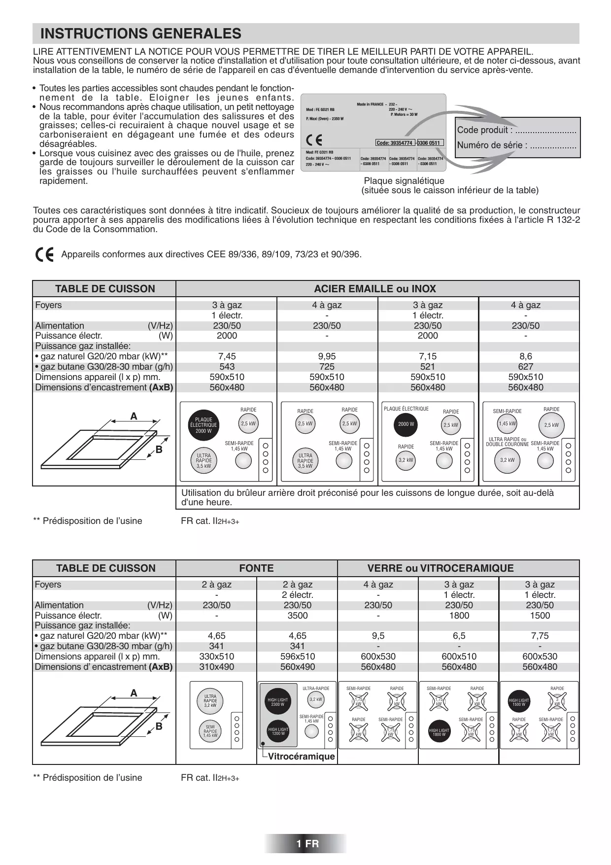 FR GB IT ES INSTRUCTIONS GENERALES LIRE ATTENTIVEMENT LA NOTICE POUR VOUS PERMETTRE DE TIRER LE MEILLEUR PARTI DE VOTRE APPAREIL. Nous vous conseillons de conserver la notice d'installation et d'utilisation pour toute consultation ultérieure, et de noter ci-dessous, avant installation de la table, le numéro de série de l'appareil en cas d'éventuelle demande d'intervention du service après-vente. • Toutes les parties accessibles sont chaudes pendant le fonctionnement de la table. Eloigner les jeunes enfants. • Nous recommandons après chaque utilisation, un petit nettoyage de la table, pour éviter l'accumulation des salissures et des graisses; celles-ci recuiraient à chaque nouvel usage et se carboniseraient en dégageant une fumée et des odeurs désagréables. • Lorsque vous cuisinez avec des graisses ou de l'huile, prenez garde de toujours surveiller le déroulement de la cuisson car les graisses ou l'huile surchauffées peuvent s'enflammer rapidement.