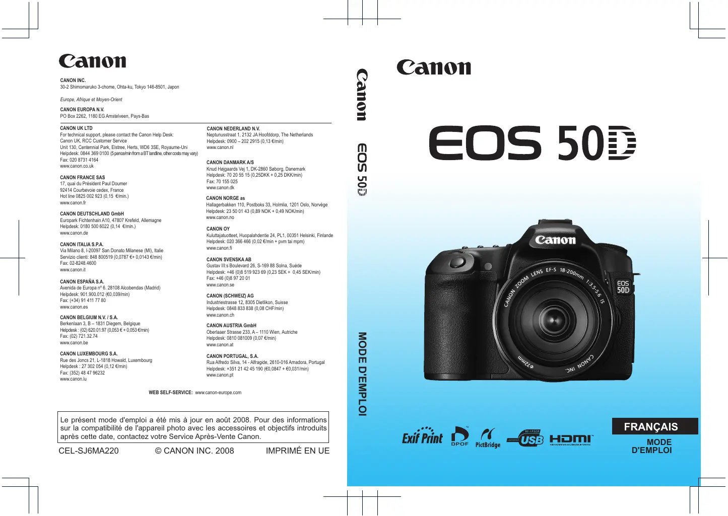 Retrouvez gratuitement la notice de l'appareil EOS 50D CANON au format PDF.