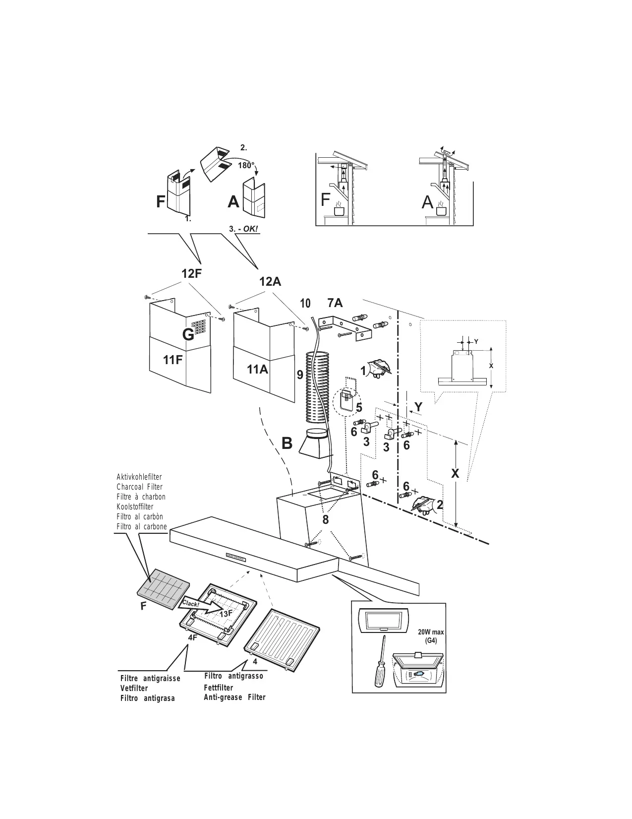 S'il est impossible d'évacuer les fumées et vapeurs de cuisson vers l'extérieur, vous devez utiliser la hotte en version filtrante F en montant 1 filtre à charbons actifs F, les fumées et vapeurs seront recyclées et évacuées par la grille supérieure G.