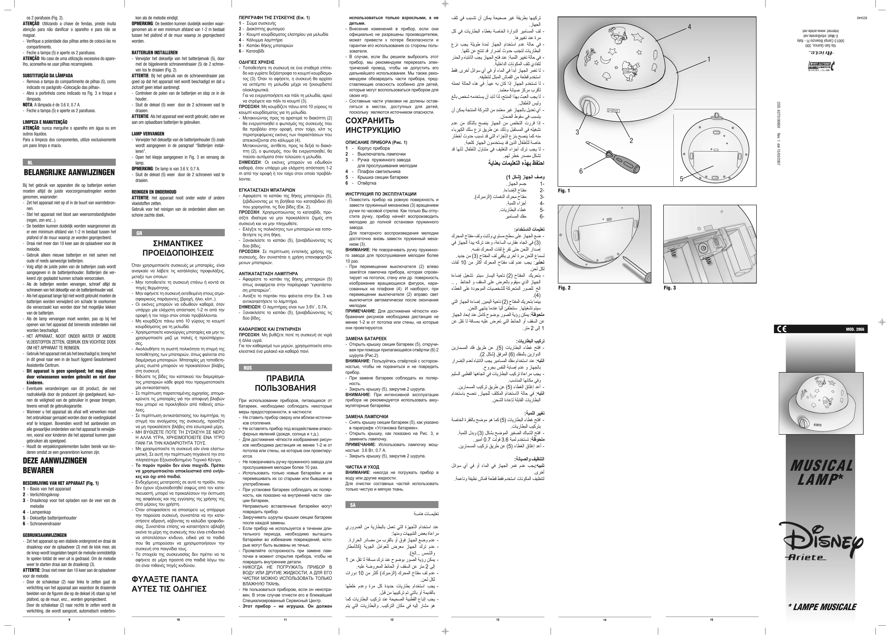 - Positionner l'appareil sur une surface stable et tourner vers la droite la poignée de rechargement du ressort (3) ; lorsque vous relâchez la poignée, l'appareil commence à émettre la mélodie jusqu'au déchargement complet du ressort. Pour réactiver la mélodie, il suffit de tourner à nouveau la poignée de rechargement (3). ATTENTION: Ne donnez pas plus de 10 tours à la poignée de rechargement du ressort pour la mélodie.