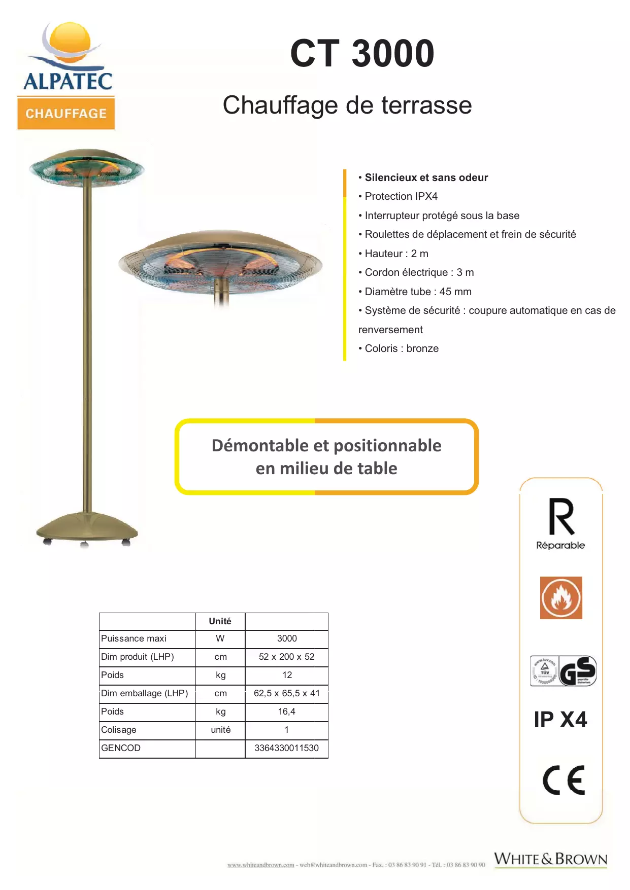 Non, l'ALPATEC CT3000 est conçu pour un usage intérieur uniquement. Ne l'exposez pas à l'humidité ou aux intempéries.