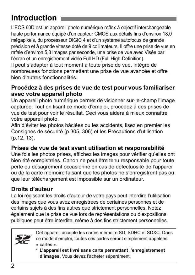 Introduction L’EOS 60D est un appareil photo numérique reflex à objectif interchangeable haute performance équipé d’un capteur CMOS aux détails fins d’environ 18,0 mégapixels, du processeur DIGIC 4 et d’un système autofocus de grande précision et à grande vitesse doté de 9 collimateurs. Il offre une prise de vue en rafale d’environ 5,3 images par seconde, une prise de vue avec Visée par l’écran et un enregistrement vidéo Full HD (Full High-Definition). Il peut s’adapter à tout moment à toute prise de vue, intègre de nombreuses fonctions permettant une prise de vue avancée et offre bien d’autres fonctionnalités. Procédez à des prises de vue de test pour vous familiariser avec votre appareil photo Un appareil photo numérique permet de visionner sur-le-champ l’image capturée. Tout en lisant ce mode d’emploi, procédez à des prises de vue de test pour voir le résultat. Ceci vous aidera à mieux connaître votre appareil photo. Afin d’éviter les photos bâclées ou les accidents, lisez en premier les Consignes de sécurité (p.305, 306) et les Précautions d’utilisation (p.12, 13). Prises de vue de test avant utilisation et responsabilité Une fois les photos prises, affichez les images pour vérifier qu’elles ont bien été enregistrées. Canon ne peut être tenu responsable pour toute perte ou désagrément occasionné en cas de défectuosité de l’appareil ou de la carte mémoire faisant que les photos ne s’enregistrent pas ou que leur téléchargement est impossible sur un ordinateur. Droits d’auteur La loi régissant les droits d’auteur de votre pays peut interdire l’utilisation des images que vous avez enregistrées de certaines personnes et de certains sujets à des fins autres que strictement personnelles. Notez également que la prise de vue lors de représentations ou d’expositions publiques peut être interdite, même à des fins strictement personnelles. Cet appareil accepte les cartes mémoire SD, SDHC et SDXC. Dans ce mode d’emploi, toutes ces cartes seront simplement appelées « cartes ».