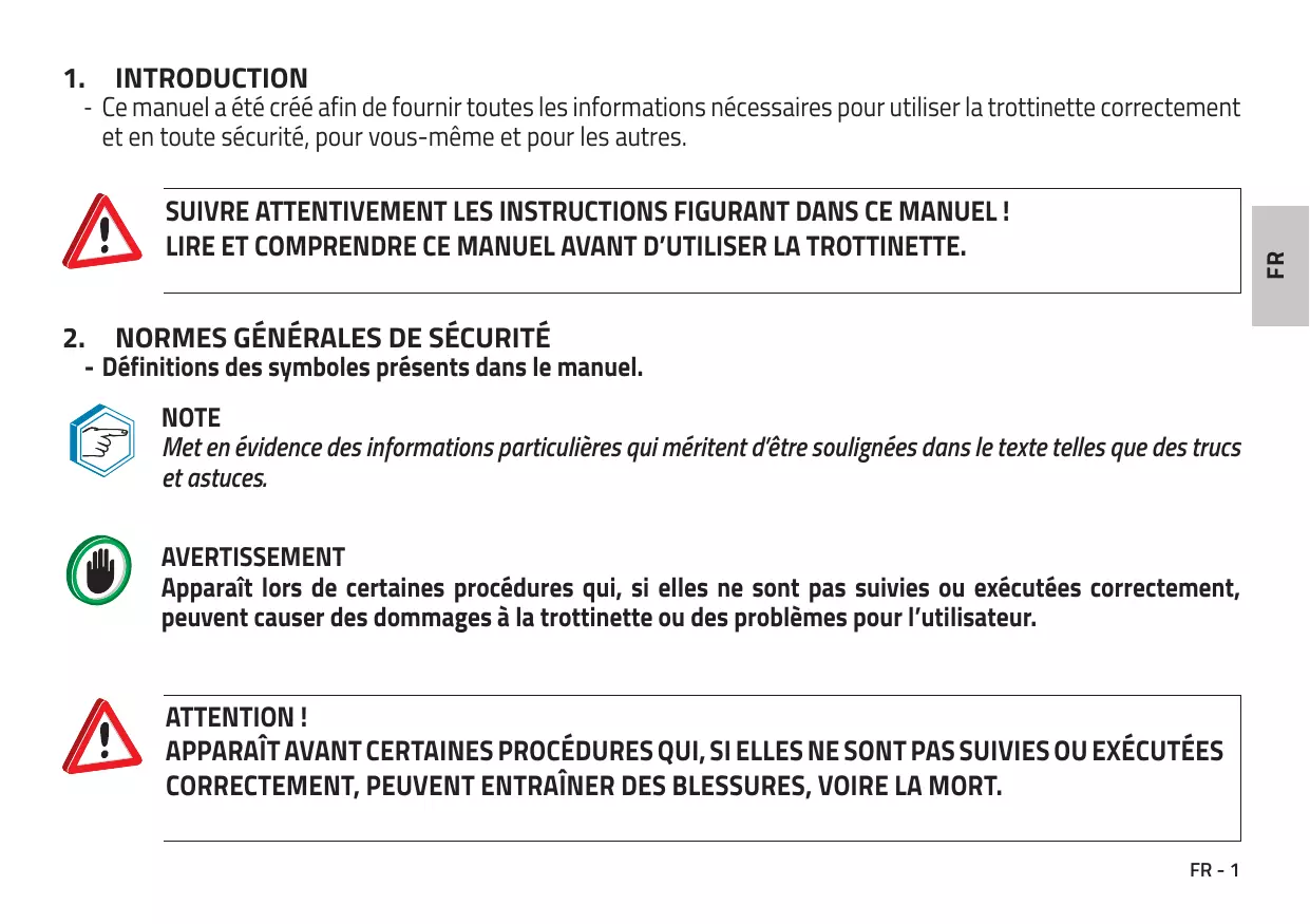 6 DÉCLARATION DE CONFORMITÉ CE FR-7 7 MISE AU REBUT CORRECTE DE CE PRODUIT FR-7 8 RETRAIT DE L’EMBALLAGE FR-8 9 DESCRIPTION DE LA TROTTINETTE FR-9 10 ÉCRAN D’AFFICHAGE ET TOUCHES DE FONCTIONFR-10 11 MONTAGE DE LA TROTTINETTEFR-12 12 CHARGEMENT DE LA BATTERIEFR-14 13 UTILISATION DE LA TROTTINETTEFR-15 14 FERMER ET TRANSPORTER LA TROTTINETTEFR-20 15 ENTRETIENFR-22 16 PROBLÈMES ET SOLUTIONSFR-23 17 GARANTIEFR-24 18 CARACTÉRISTIQUES TECHNIQUESFR-25 LIRE ET COMPRENDRE CE MANUEL AVANT D’UTILISER LA TROTTINETTE. 2. NORMES GÉNÉRALES DE SÉCURITÉ - Définitions des symboles présents dans le manuel. NOTE Met en évidence des informations particulières qui méritent d’être soulignées dans le texte telles que des trucs et astuces. AVERTISSEMENT Apparaît lors de certaines procédures qui, si elles ne sont pas suivies ou exécutées correctement, peuvent causer des dommages à la trottinette ou des problèmes pour l’utilisateur.