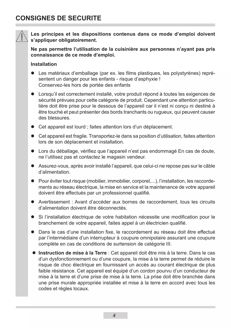 Les principes et les dispositions contenus dans ce mode d’emploi doivent s’appliquer obligatoirement. Ne pas permettre l’utilisation de la cuisinière aux personnes n’ayant pas pris connaissance de ce mode d’emploi. Installation l Les matériaux d’emballage (par ex. les films plastiques, les polystyrènes) représentent un danger pour les enfants - risque d’asphyxie ! Conservez-les hors de portée des enfants l Lorsqu’il est correctement installé, votre produit répond à toutes les exigences de sécurité prévues pour cette catégorie de produit. Cependant une attention particulière doit être prise pour le dessous de l’appareil car il n’est ni conçu ni destiné à être touché et peut présenter des bords tranchants ou rugueux, qui peuvent causer des blessures. l Cet appareil est lourd ; faites attention lors d’un déplacement. l Cet appareil est fragile. Transportez-le dans sa position d’utilisation, faites attention lors de son déplacement et installation. l Lors du déballage, vérifiez que l’appareil n’est pas endommagé En cas de doute, ne l’utilisez pas et contactez le magasin vendeur. l Assurez-vous, après avoir installé l’appareil, que celui-ci ne repose pas sur le câble d’alimentation. l Pour éviter tout risque (mobilier, immobilier, corporel,...), l’installation, les raccordements au réseau électrique, la mise en service et la maintenance de votre appareil doivent être effectués par un professionnel qualifié. l Avertissement : Avant d’accéder aux bornes de raccordement, tous les circuits d’alimentation doivent être déconnectés. l Si l’installation électrique de votre habitation nécessite une modification pour le branchement de votre appareil, faites appel à un électricien qualifié. l Dans le cas d’une installation fixe, le raccordement au réseau doit être effectué par l’intermédiaire d’un interrupteur à coupure omnipolaire assurant une coupure complète en cas de conditions de surtension de catégorie III. l Instruction de mise à la Terre : Cet appareil doit être mis à la terre. Dans le cas d’un dysfonctionnement ou d’une coupure, la mise à la terre permet de réduire le risque de choc électrique en fournissant un accès au courant électrique de plus faible résistance. Cet appareil est équipé d’un cordon pourvu d’un conducteur de mise à la terre et d’une prise de mise à la terre. La prise doit être branchée dans une prise murale appropriée installée et mise à la terre en accord avec tous les codes et règles locaux.