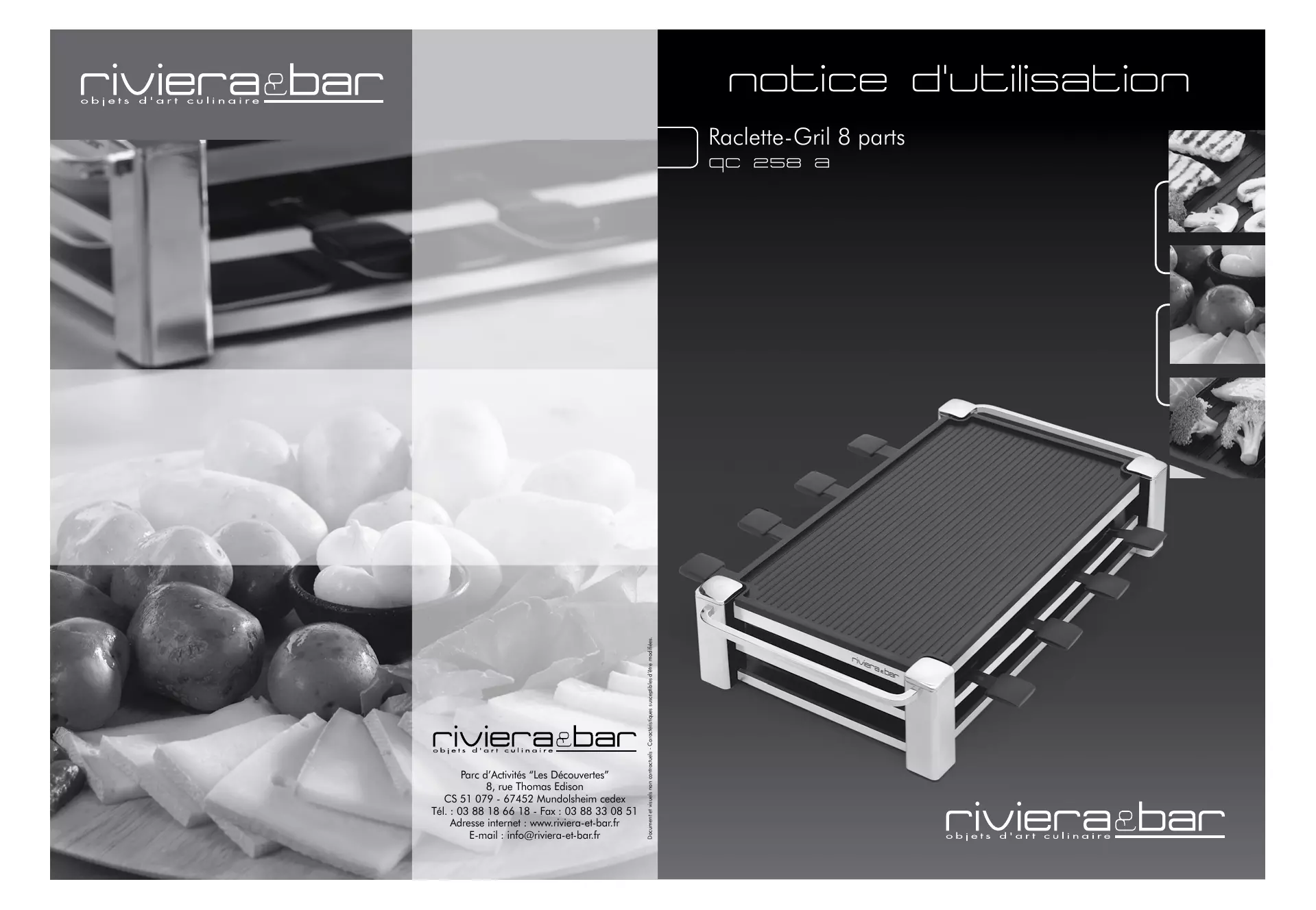 notice d'utilisation Parc d’Activités “Les Découvertes” 8, rue Thomas Edison CS 51 079 - 67452 Mundolsheim cedex Tél. : 03 88 18 66 18 - Fax : 03 88 33 08 51 Adresse internet : www.riviera-et-bar.fr E-mail : info@riviera-et-bar.fr Document et visuels non contractuels - Caractéristiques susceptibles d’être modifiées. Raclette-Gril 8 parts qc 258 a description du produit Avec cet appareil, vous avez fait l’acquisition d’un article de qualité, bénéficiant de toute l’expérience de Riviera & Bar dans le domaine de la cuisson. Il répond aux critères de qualité Riviera & Bar : les meilleurs matériaux et composants ont été utilisés pour sa fabrication, et il a été soumis à des contrôles rigoureux. Nous souhaitons que son usage vous apporte entière satisfaction. Nous vous demandons de lire très attentivement les instructions indiquées dans cette notice, car elles fournissent, entre autres, des informations importantes relatives à la sécurité d’installation, d’utilisation et d’entretien. Gardez votre notice, vous pourriez avoir besoin de vous y référer dans le futur. description du produit