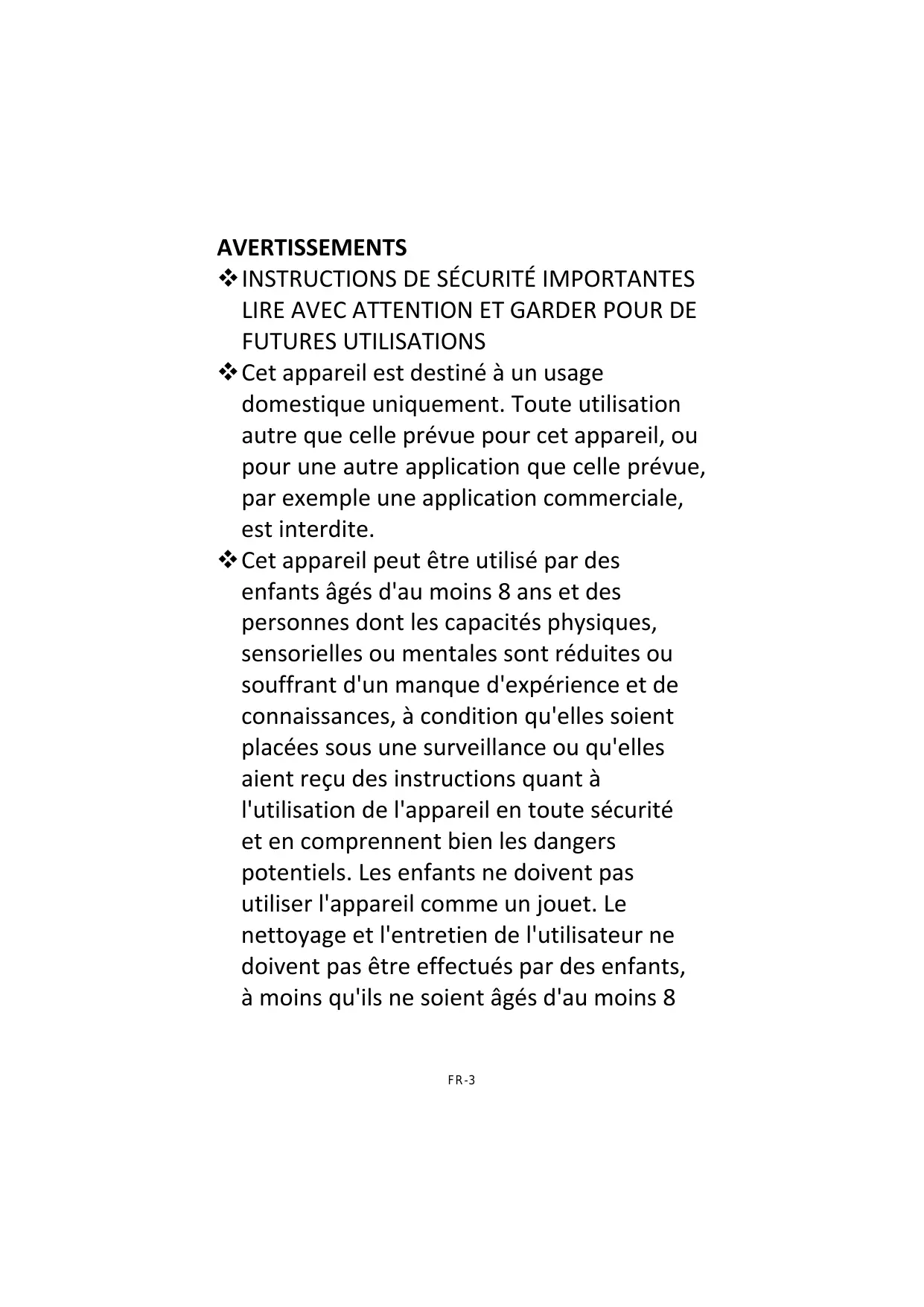 LIRE AVEC ATTENTION ET GARDER POUR DE FUTURES UTILISATIONS Cet appareil est destiné à un usage domestique uniquement. Toute utilisation autre que celle prévue pour cet appareil, ou pour une autre application que celle prévue, par exemple une application commerciale, est interdite. Cet appareil peut être utilisé par des enfants âgés d'au moins 8 ans et des personnes dont les capacités physiques, sensorielles ou mentales sont réduites ou souffrant d'un manque d'expérience et de connaissances, à condition qu'elles soient placées sous une surveillance ou qu'elles aient reçu des instructions quant à l'utilisation de l'appareil en toute sécurité et en comprennent bien les dangers potentiels. Les enfants ne doivent pas utiliser l'appareil comme un jouet. Le nettoyage et l'entretien de l'utilisateur ne doivent pas être effectués par des enfants, à moins qu'ils ne soient âgés d'au moins 8 FR-3 ans et qu'ils soient sous la surveillance d'un adulte. Si le câble d'alimentation est endommagé, il doit être remplacé par le fabricant, son service après vente ou des personnes de qualification similaire afin d'éviter un danger. Ne pas utiliser de produits d'entretien abrasifs ou de grattoirs métalliques durs pour nettoyer la porte en verre du four, ce qui pourrait érafler la surface et entraîner l’éclatement du verre. MISE EN GARDE: Si la porte ou le joint de porte est endommagé, le four ne doit pas être mis en fonctionnement avant d’avoir été réparé par une personne compétente. MISE EN GARDE: Il est dangereux pour quiconque autre qu’une personne compétente d’effectuer des opérations de maintenance ou de réparation entraînant le retrait d’un couvercle qui protège de l’exposition à l’énergie micro‐ondes. MISE EN GARDE: Les liquides et autres aliments ne doivent pas être chauffés dans des contenants fermés hermétiquement FR-4 car ils risquent d’exploser. Laissez un espace libre minimal de 30 cm au‐dessus de la surface supérieure du four. N’utiliser que des ustensiles appropriés à l’usage dans les fours micro‐ondes. Pendant le chauffage de denrées alimentaires dans des contenants en plastique ou en papier, garder un oeil sur le four en raison de la possibilité d’inflammation. Le four à micro‐ondes est prévu pour chauffer des denrées alimentaires et des boissons. Le séchage de denrées alimentaires ou de linge et le chauffage de coussins chauffants, pantoufles, éponges, linge humide et autres articles similaires peuvent entraîner des risques de blessures, d’inflammation ou de feu. Si de la fumée est émise, arrêter ou débrancher le four et garder la porte fermée pour étouffer les flammes éventuelles. Le chauffage des boissons par micro‐ondes peut provoquer un jaillissement brusque et différé de liquide en ébullition, aussi des FR-5 précautions doivent elles être prises lors de la manipulation du récipient. Le contenu des biberons et des pots d’aliments pour bébé doit être remué ou agité et la température doit en être vérifiée avant consommation, de façon à éviter les brûlures. Il n’est pas recommandé de chauffer les oeufs dans leur coquille et les oeufs durs entiers dans un four micro‐ondes car ils risquent d’exploser, même après la fin de cuisson. Les détails pour nettoyer les joints de portes, les cavités et parties adjacentes sont définis en pages FR15‐16 dans la section “NETTOYAGE ET ENTRETIEN ”. Il est recommandé de nettoyer le four régulièrement et d’enlever tout dépôt alimentaire. Si l’appareil n’est pas maintenu dans un bon état de propreté, sa surface pourrait se dégrader et affecter de façon inexorable la durée de vie de l’appareil et conduire à une situation dangereuse. Le four à micro‐ondes est conçu pour être FR-6 utilisé en pose libre. L’appareil ne doit pas être placé dans un meuble. Appareil de groupe 2 Classe B Cet appareil est un appareil de Groupe 2 car il produit intentionnellement de l'‐énergie à fréquence radioélectrique pour le traitement de la matière et il est destiné à être utilisé dans un local domestique ou un établissement raccordé directement au réseau de distribution d'électricité à basse tension alimentant des bâtiments à usage domestique (Classe B). L’arrière de l’appareil doit être placé contre un mur.