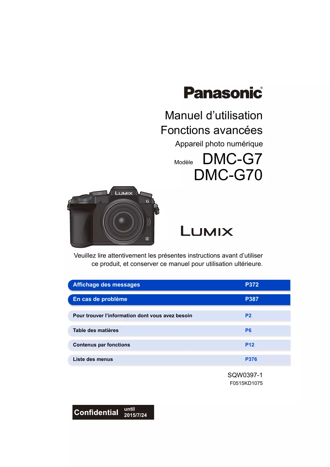Manuel d’utilisation Fonctions avancées Appareil photo numérique Modèle DMC-G7 DMC-G70 Veuillez lire attentivement les présentes instructions avant d’utiliser ce produit, et conserver ce manuel pour utilisation ultérieure. Affichage des messages P372 En cas de problème P387 Pour trouver l’information dont vous avez besoin