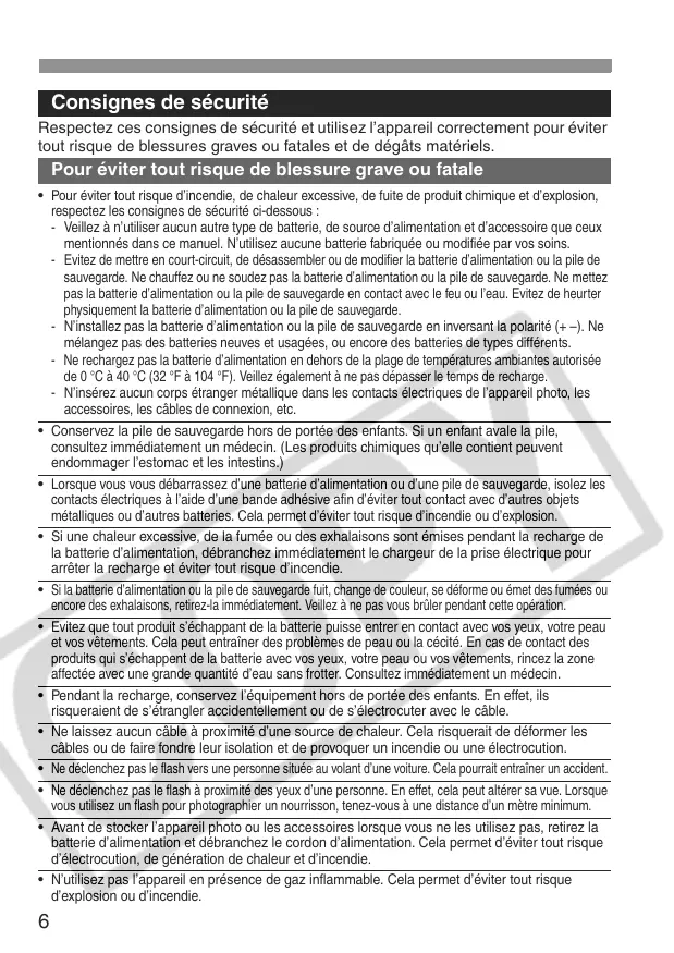 - Pour éviter tout risque d’incendie, de chaleur excessive, de fuite de produit chimique et d’explosion, respectez les consignes de sécurité ci-dessous : - Veillez à n’utiliser aucun autre type de batterie, de source d’alimentation et d’accessoire que ceux mentionnés dans ce manuel. N’utilisez aucune batterie fabriquée ou modifiée par vos soins. - Evitez de mettre en court-circuit, de désassembler ou de modifier la batterie d’alimentation ou la pile de sauvegarde. Ne chauffez ou ne soudez pas la batterie d’alimentation ou la pile de sauvegarde. Ne mettez pas la batterie d’alimentation ou la pile de sauvegarde en contact avec le feu ou l’eau. Evitez de heurter physiquement la batterie d’alimentation ou la pile de sauvegarde. - N’installez pas la batterie d’alimentation ou la pile de sauvegarde en inversant la polarité (+ –). Ne mélangez pas des batteries neuves et usagées, ou encore des batteries de types différents. - Ne rechargez pas la batterie d’alimentation en dehors de la plage de températures ambiantes autorisée de 0 °C à 40 °C (32 °F à 104 °F). Veillez également à ne pas dépasser le temps de recharge. - N’insérez aucun corps étranger métallique dans les contacts électriques de l’appareil photo, les accessoires, les câbles de connexion, etc.