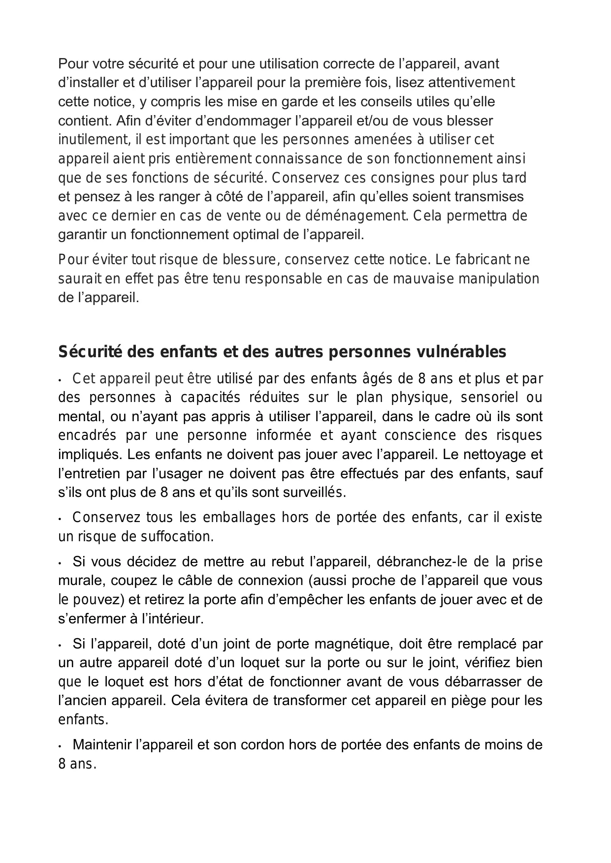 Si vous décidez de mettre au rebut l’appareil, débranchez-le de la prise murale, coupez le câble de connexion (aussi proche de l’appareil que vous le pouvez) et retirez la porte afin d’empêcher les enfants de jouer avec et de s’enfermer à l’intérieur. •