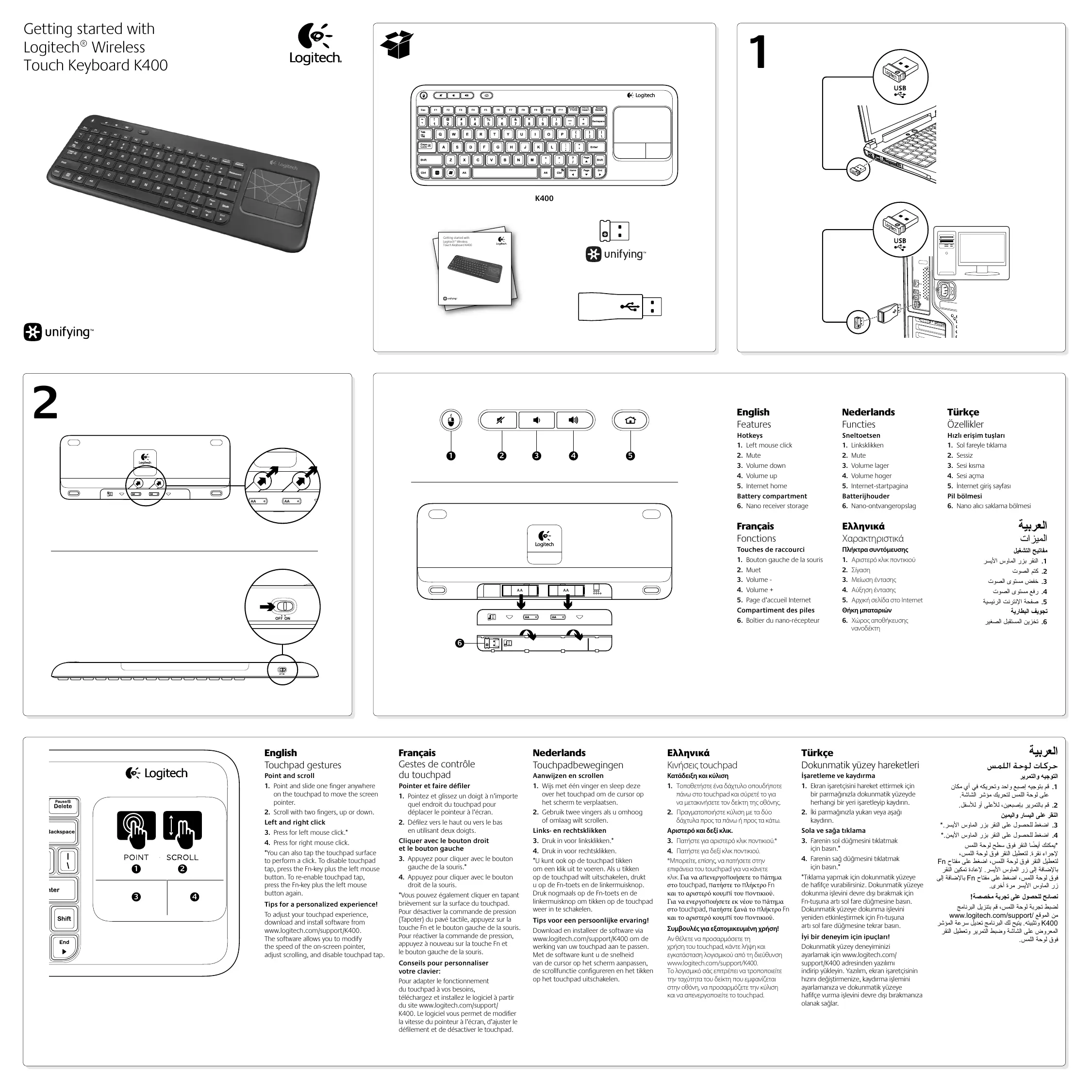 *You can also tap the touchpad surface to perform a click. To disable touchpad tap, press the Fn-key plus the left mouse button. To re-enable touchpad tap, press the Fn-key plus the left mouse button again. Tips for a personalized experience! To adjust your touchpad experience, download and install software from www.logitech.com/support/K400. The software allows you to modify the speed of the on-screen pointer, adjust scrolling, and disable touchpad tap. Français Gestes de contrôle du touchpad Pointer et faire défiler