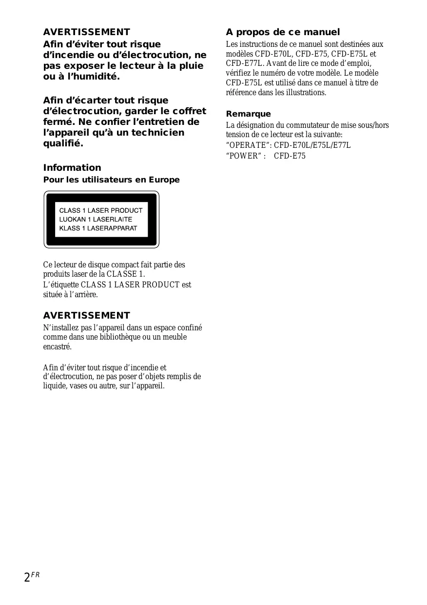 Les instructions de ce manuel sont destinées aux modèles CFD-E70L, CFD-E75, CFD-E75L et CFD-E77L. Avant de dire ce mode d'emploi, vérifie le numéro de votre modèle. Le modele CFD-E75L est utilisé dans ce manuel à titre de referencia dans les illustrations.