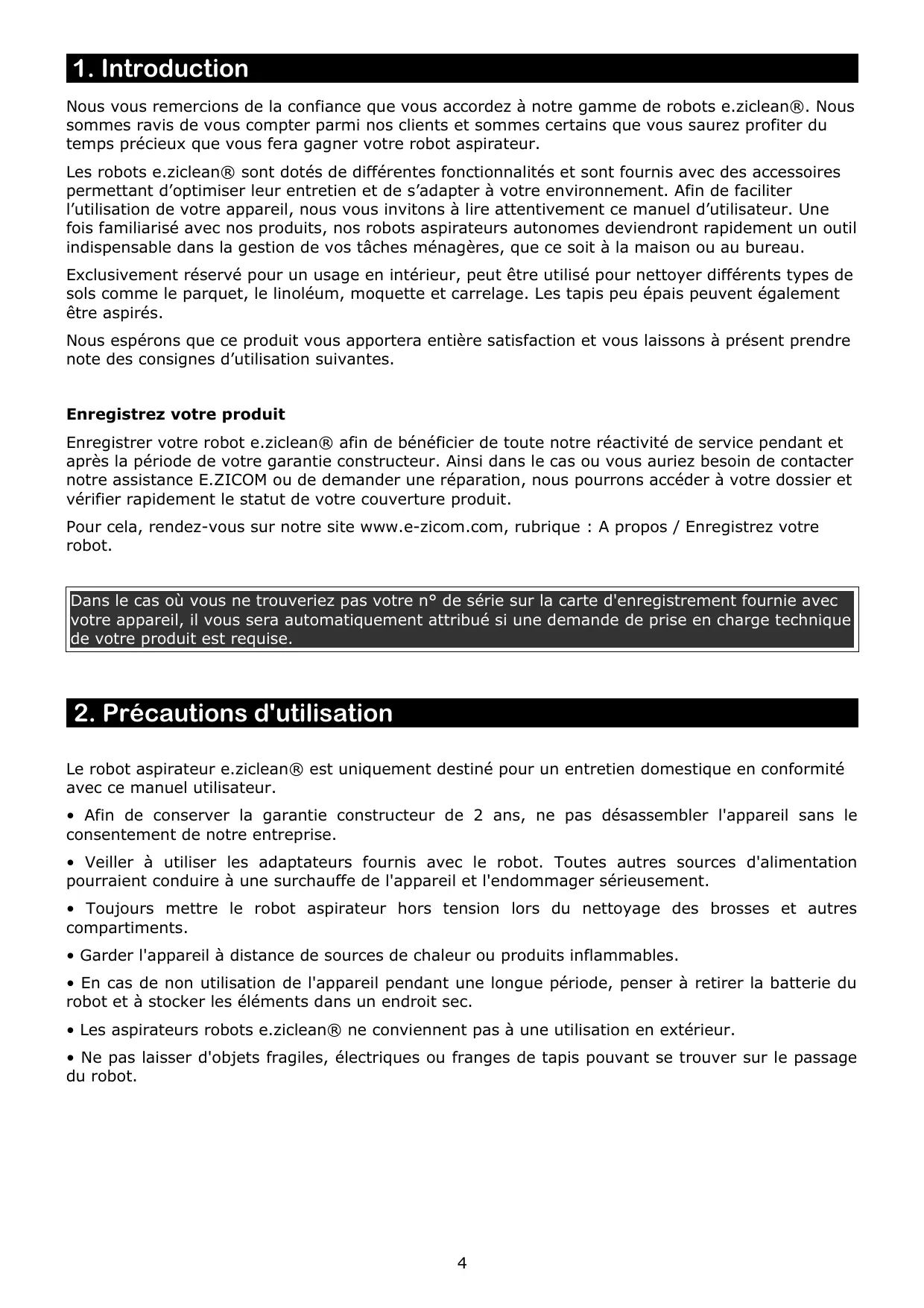 Nous vous remercions de la confiance que vous accordez à notre gamme de robots e.ziclean®. Nous sommes ravis de vous compter parmi nos clients et sommes certains que vous saurez profiter du temps précieux que vous fera gagner votre robot aspirateur. Les robots e.ziclean® sont dotés de différentes fonctionnalités et sont fournis avec des accessoires permettant d’optimiser leur entretien et de s’adapter à votre environnement. Afin de faciliter l’utilisation de votre appareil, nous vous invitons à lire attentivement ce manuel d’utilisateur. Une fois familiarisé avec nos produits, nos robots aspirateurs autonomes deviendront rapidement un outil indispensable dans la gestion de vos tâches ménagères, que ce soit à la maison ou au bureau. Exclusivement réservé pour un usage en intérieur, peut être utilisé pour nettoyer différents types de sols comme le parquet, le linoléum, moquette et carrelage. Les tapis peu épais peuvent également être aspirés. Nous espérons que ce produit vous apportera entière satisfaction et vous laissons à présent prendre note des consignes d’utilisation suivantes. Enregistrez votre produit Enregistrer votre robot e.ziclean® afin de bénéficier de toute notre réactivité de service pendant et après la période de votre garantie constructeur. Ainsi dans le cas ou vous auriez besoin de contacter notre assistance E.ZICOM ou de demander une réparation, nous pourrons accéder à votre dossier et vérifier rapidement le statut de votre couverture produit. Pour cela, rendez-vous sur notre site www.e-zicom.com, rubrique : A propos / Enregistrez votre robot. Dans le cas où vous ne trouveriez pas votre n° de série sur la carte d'enregistrement fournie avec votre appareil, il vous sera automatiquement attribué si une demande de prise en charge technique de votre produit est requise.