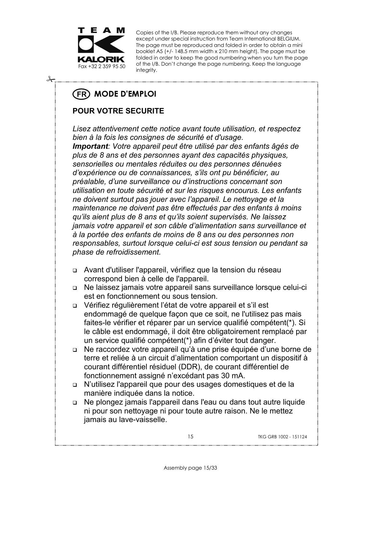 Nous, Team Kalorik SA/NV, confirmons par la presente que notre produit correspond aux exigences de la directive 1275/2008/CE. Certes, notre produit n'est pas équipé d'une fonction pour minimaler la consommation de puissance, ce qui devrait selon la directive 1275/2008/CE mettre le produit en mode éteint ou mode veille après avoir fini sa fonction principale, mais ceci est pratiquement impossible, car cela nuirait à la fonction principale du produit si fortement que l'utilisation du produit ne serait plus possible!