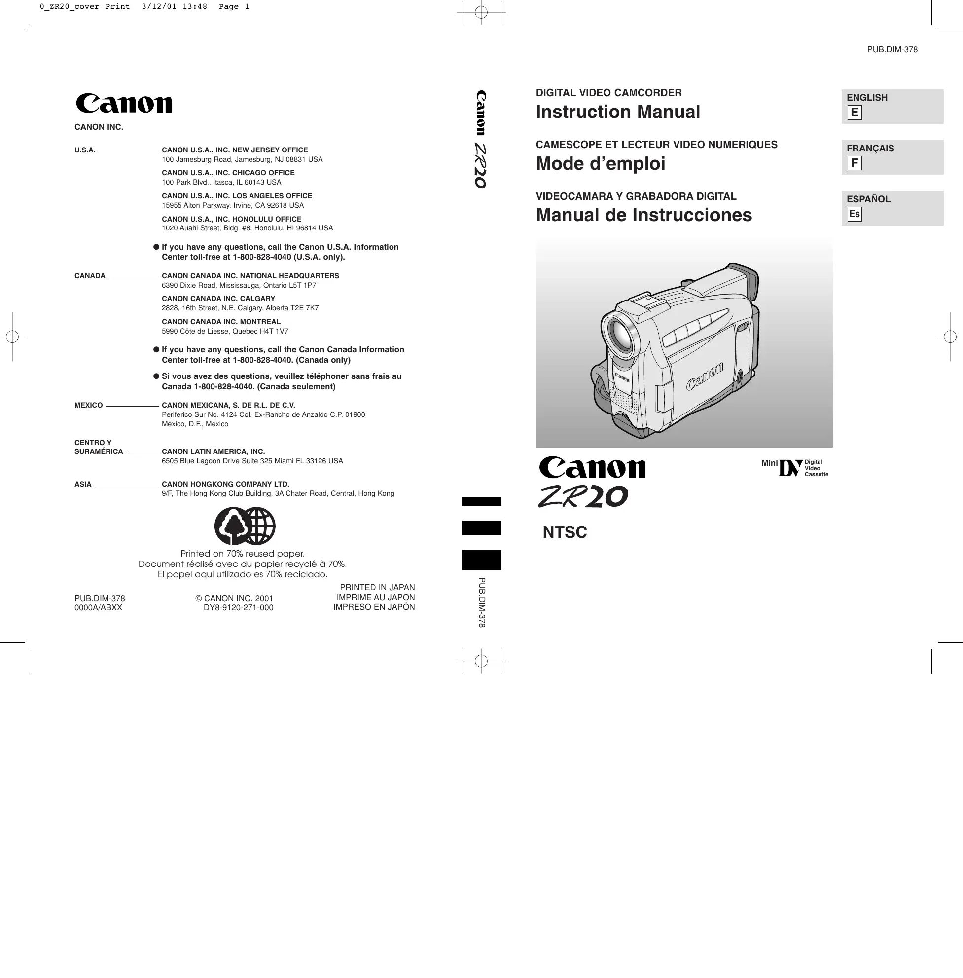 Téléchargez la notice de votre Caméscope au format PDF gratuitement ! Retrouvez votre notice ZR20 - CANON et reprennez votre appareil électronique en main. Sur cette page sont publiés tous les documents nécessaires à l'utilisation de votre appareil ZR20 de la marque CANON.