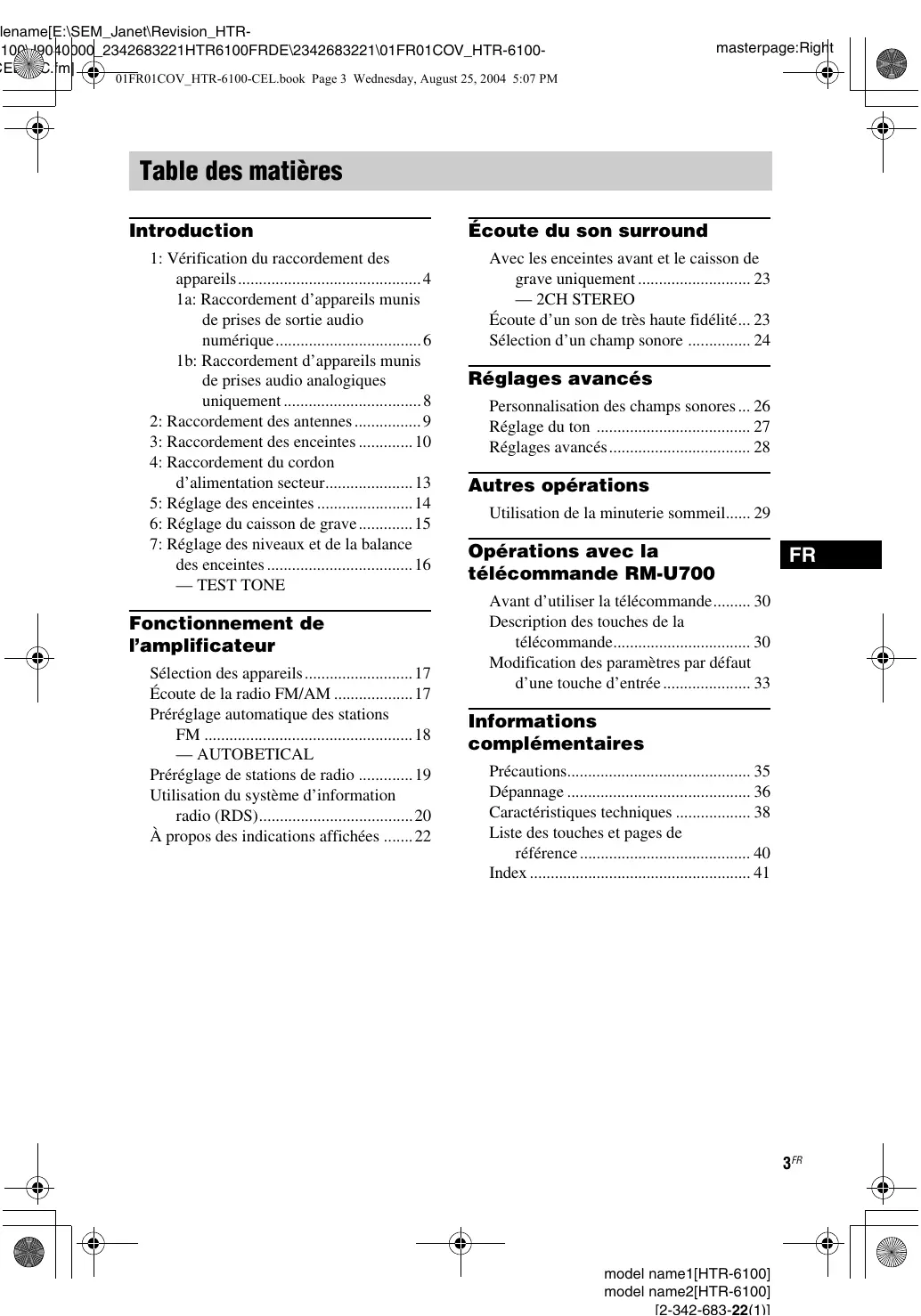 • Ne pliez et ne tordez jamais les cordons numériques optiques. 5FR model name1[HTR-6600] model name2[HTR-6100] lename[E:\SEM_Janet\Revision_HTR100\J9040000_2342683221HTR6100FRDE\2342683221\01FR03CON_HTR-6100-CEL.fm] masterpage:Left 01FR01COV_HTR-6100-CEL.book Page 6 Wednesday, August 25, 2004 5:07 PM