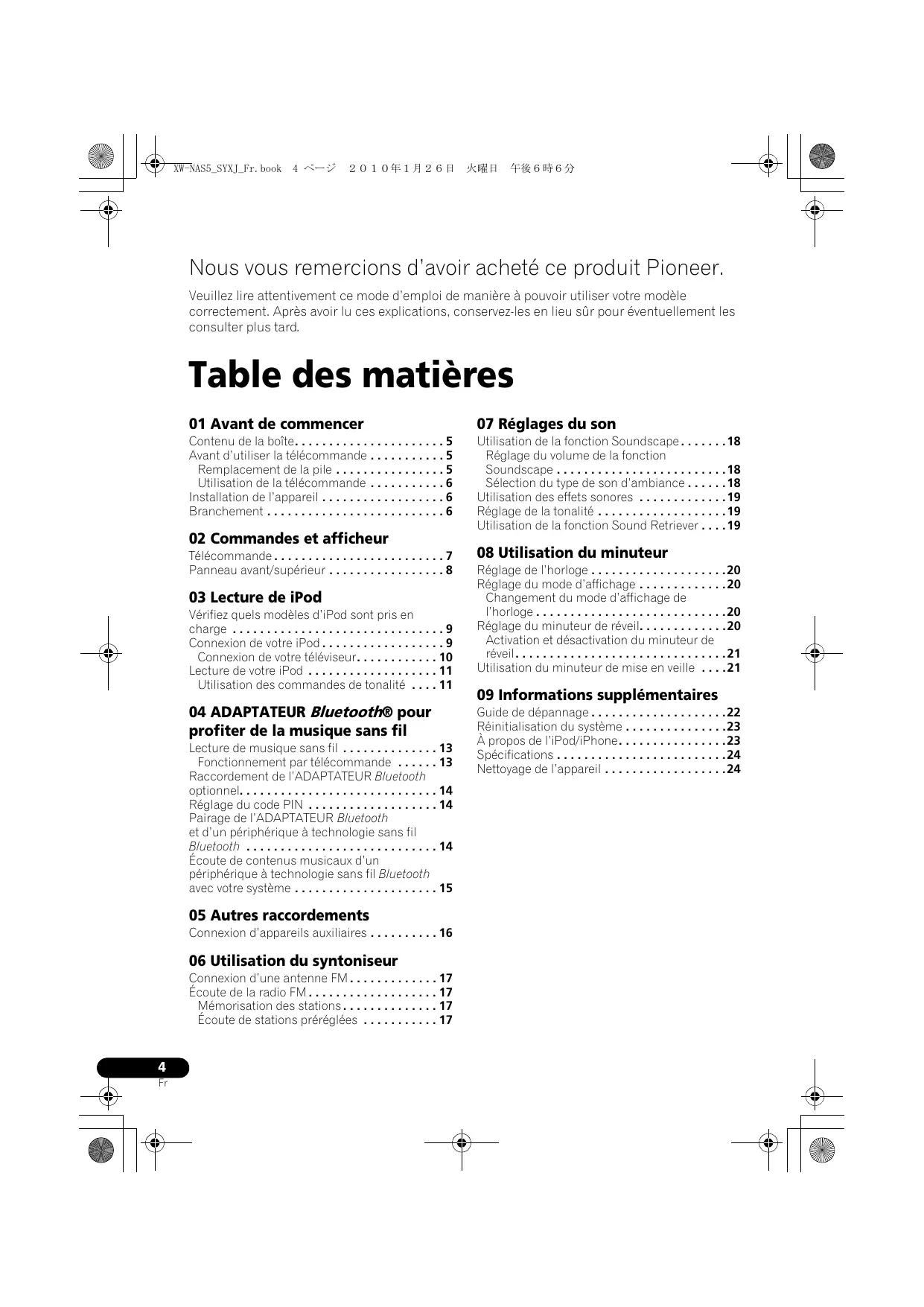 Nettoyage de l’appareil • Utilisez un chiffon sec pour essuyer la poussière et la saleté. • Lorsque le surface est sale, essuyez avec un chiffon doux trempé dans un nettoyant neutre dilué dans une dose cinq ou six fois supérieure d’eau, et bien essoré. Essuyez encore avec un chiffon sec. N’utilisez pas de cire ou nettoyant pour meubles. • N’utilisez jamais de diluants, benzine, insecticides en bombe ou autres produits chimiques sur ou près de cet appareil au risque d’entraîner une corrosion. Publication de Pioneer Corporation. © 2010 Pioneer Corporation. Tous droits de reproduction et de traduction réservés.