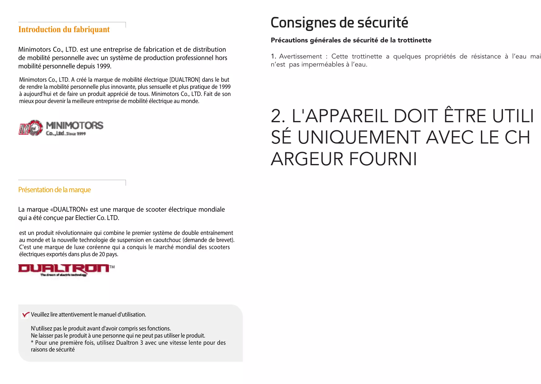 Minimotors Co., LTD. A créé la marque de mobilité électrique [DUALTRON] dans le but de prendre la mobilité personnelle plus innovante, plus sensuelle et plus pratique de 1999 à aujourd'hui et de faire un produit apprécié de tous. Minimotors Co., LTD. Fait de son derniers pour devenir la meilleure entreprise de mobilité électrique au monde.