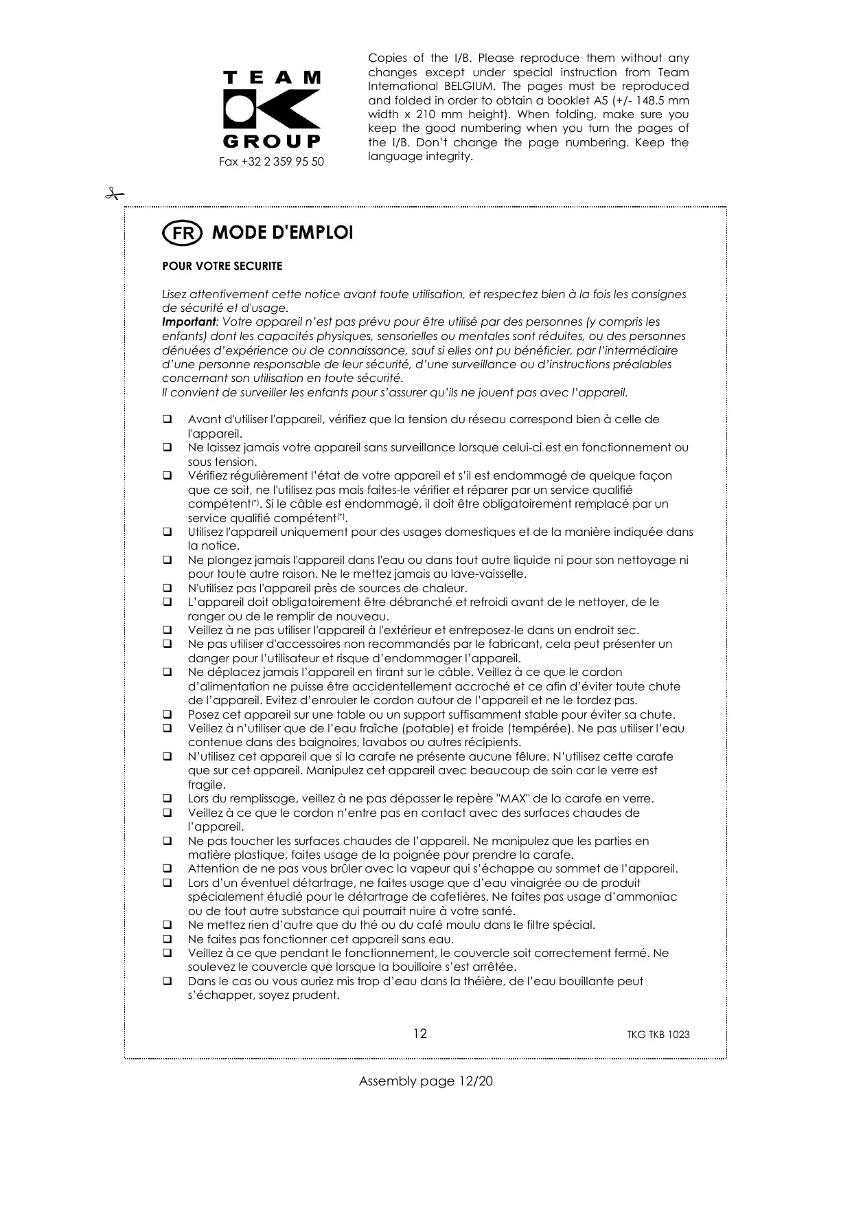 Assembly page 12/20 TKG TKB 1023 Fax +32 2 359 95 50 Copies of the I/B. Please reproduce them without any changes except under special instruction from Team International BELGIUM. The pages must be reproduced and folded in order to obtain a booklet A5 (+/- 148.5 mm width x 210 mm height). When folding, make sure you keep the good numbering when you turn the pages of the I/B. Don’t change the page numbering. Keep the language integrity.