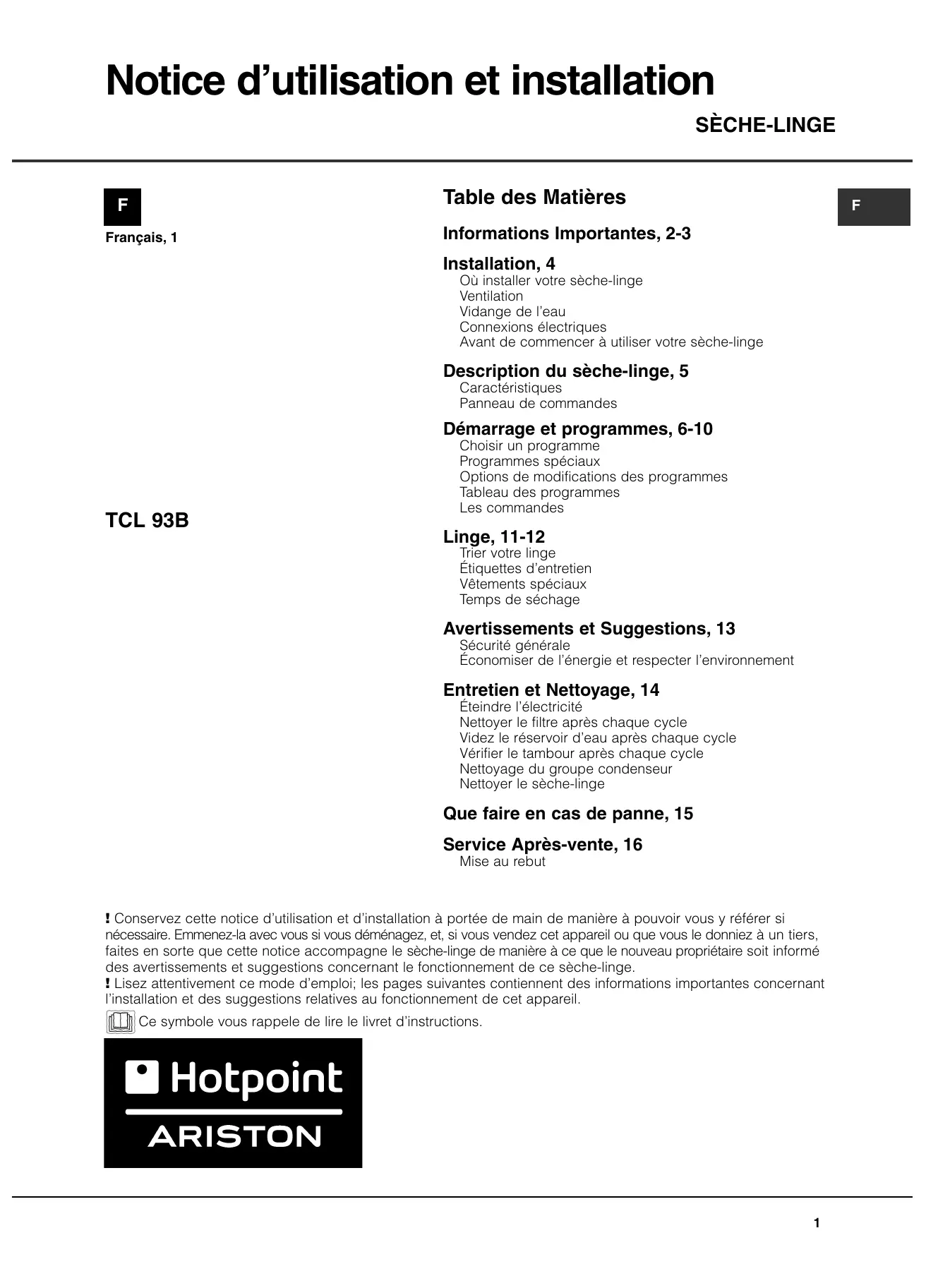Retrouvez gratuitement la notice de l'appareil TCL93B6H/Z1 HOTPOINT au format PDF.