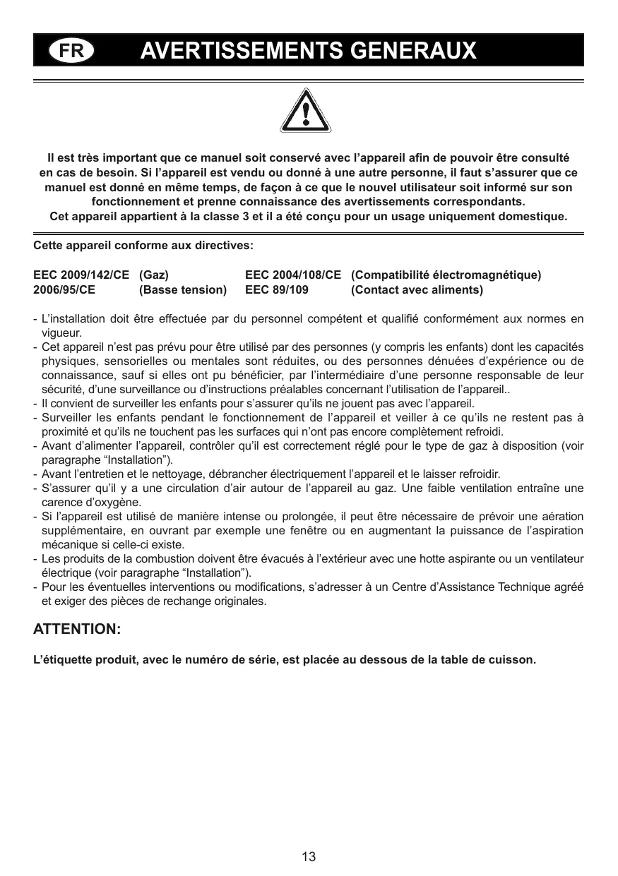 AVERTISSEMENTS GENERAUX Il est très important que ce manuel soit conservé avec l’appareil afin de pouvoir être consulté en cas de besoin. Si l’appareil est vendu ou donné à une autre personne, il faut s’assurer que ce manuel est donné en même temps, de façon à ce que le nouvel utilisateur soit informé sur son fonctionnement et prenne connaissance des avertissements correspondants. Cet appareil appartient à la classe 3 et il a été conçu pour un usage uniquement domestique. Cette appareil conforme aux directives: EEC 2009/142/CE (Gaz) 2006/95/CE (Basse tension) EEC 2004/108/CE (Compatibilité électromagnétique) EEC 89/109 (Contact avec aliments) -- L’installation doit être effectuée par du personnel compétent et qualifié conformément aux normes en vigueur. -- Cet appareil n’est pas prévu pour être utilisé par des personnes (y compris les enfants) dont les capacités physiques, sensorielles ou mentales sont réduites, ou des personnes dénuées d’expérience ou de connaissance, sauf si elles ont pu bénéficier, par l’intermédiaire d’une personne responsable de leur sécurité, d’une surveillance ou d’instructions préalables concernant l’utilisation de l’appareil.. -- Il convient de surveiller les enfants pour s’assurer qu’ils ne jouent pas avec l’appareil. -- Surveiller les enfants pendant le fonctionnement de l’appareil et veiller à ce qu’ils ne restent pas à proximité et qu’ils ne touchent pas les surfaces qui n’ont pas encore complètement refroidi. -- Avant d’alimenter l’appareil, contrôler qu’il est correctement réglé pour le type de gaz à disposition (voir paragraphe “Installation”). -- Avant l’entretien et le nettoyage, débrancher électriquement l’appareil et le laisser refroidir. -- S’assurer qu’il y a une circulation d’air autour de l’appareil au gaz. Une faible ventilation entraîne une carence d’oxygène. -- Si l’appareil est utilisé de manière intense ou prolongée, il peut être nécessaire de prévoir une aération supplémentaire, en ouvrant par exemple une fenêtre ou en augmentant la puissance de l’aspiration mécanique si celle-ci existe. -- Les produits de la combustion doivent être évacués à l’extérieur avec une hotte aspirante ou un ventilateur électrique (voir paragraphe “Installation”). -- Pour les éventuelles interventions ou modifications, s’adresser à un Centre d’Assistance Technique agréé et exiger des pièces de rechange originales. ATTENTION: L’étiquette produit, avec le numéro de série, est placée au dessous de la table de cuisson.