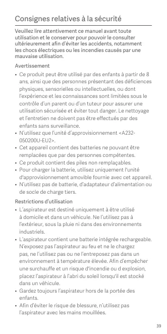 • Ce produit peut être utilisé par des enfants à partir de 8 ans, ainsi que des personnes présentant des déficiences physiques, sensorielles ou intellectuelles, ou dont l’expérience et les connaissances sont limitées sous le contrôle d’un parent ou d’un tuteur pour assurer une utilisation sécurisée et éviter tout danger. Le nettoyage et l’entretien ne doivent pas être effectués par des enfants sans surveillance. • N’utilisez que l’unité d’approvisionnement <A232050200U-EU2>. • Cet appareil contient des batteries ne pouvant être remplacées que par des personnes compétentes. • Ce produit contient des piles non remplaçables. • Pour charger la batterie, utilisez uniquement l'unité d'approvisionnement amovible fournie avec cet appareil. • N’utilisez pas de batterie, d’adaptateur d’alimentation ou de socle de charge tiers. Restrictions d’utilisation • L’aspirateur est destiné uniquement à être utilisé à domicile et dans un véhicule. Ne l’utilisez pas à l’extérieur, sous la pluie ni dans des environnements industriels. • L’aspirateur contient une batterie intégrée rechargeable. N’exposez pas l’aspirateur au feu et ne le chargez pas, ne l’utilisez pas ou ne l’entreposez pas dans un environnement à température élevée. Afin d’empêcher une surchauffe et un risque d'incendie ou d explosion, placez l’aspirateur à l’abri du soleil lorsqu'il est stocké dans un véhicule. • Gardez toujours l’aspirateur hors de la portée des enfants. • Afin d’éviter le risque de blessure, n’utilisez pas l’aspirateur avec les mains mouillées. 39