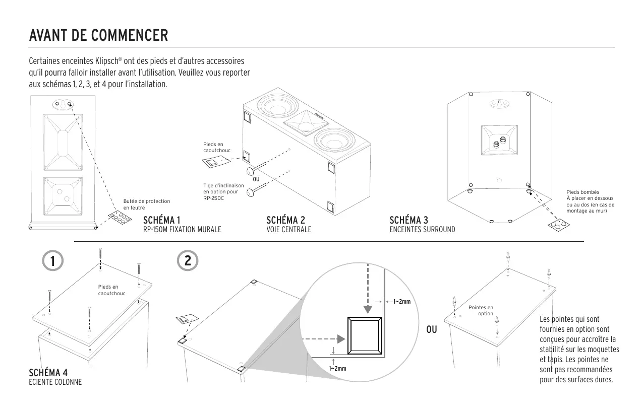 équipés de bornes de raccordement jumelées. Dans le cas d’un raccord avec un seul câble, la barre de raccord de la borne doit rester en place. Dans le cas d’un raccord double amplification ou à deux câbles (bi-câblage), la barre de raccord de la borne doit être retirée. Veuillez consulter le manuel de votre amplificateur pour de plus amples instructions. Exigences relatives à l’amplificateur — Les enceintes Klipsch sont extrêmement efficaces et fonctionneront aisément avec un large éventail d’amplificateurs. Toutes les enceintes Klipsch ont une impédance de 8 ohms et peuvent fonctionner à très haute puissance avec peu de distorsion. Compte tenu des niveaux sonores élevés que les enceintes Klipsch sont capables de restituer, soyez prudent avec le réglage du volume. Un volume excessif pendant de longues durées peut causer des dommages irréversibles de l’ouïe. Une surcharge de votre amplificateur pourrait également endommager vos enceintes. Consultez votre revendeur pour vous assurer que votre amplificateur est adapté à votre application. Nous voulons que vous écoutiez pendant toute votre vie.