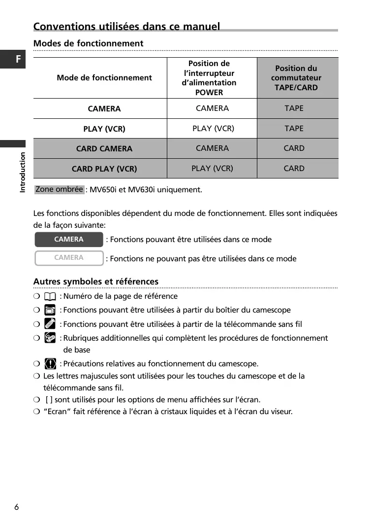 Introduction Mode de fonctionnement Position de l’interrupteur d’alimentation POWER Position du commutateur TAPE/CARD CAMERA CAMERA TAPE PLAY (VCR) PLAY (VCR) TAPE CARD CAMERA CAMERA CARD CARD PLAY (VCR) PLAY (VCR) CARD Zone ombrée : MV650i et MV630i uniquement. Les fonctions disponibles dépendent du mode de fonctionnement. Elles sont indiquées de la façon suivante: CAMERA : Fonctions pouvant être utilisées dans ce mode CAMERA : Fonctions ne pouvant pas être utilisées dans ce mode Autres symboles et références