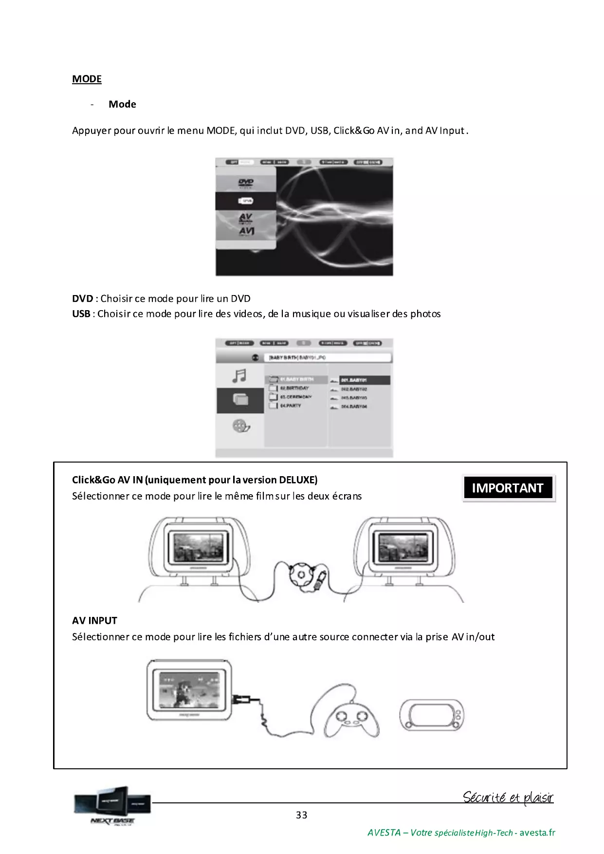 | Modes de lecture | DVD, USB, Click&Go AV IN, AV Input |