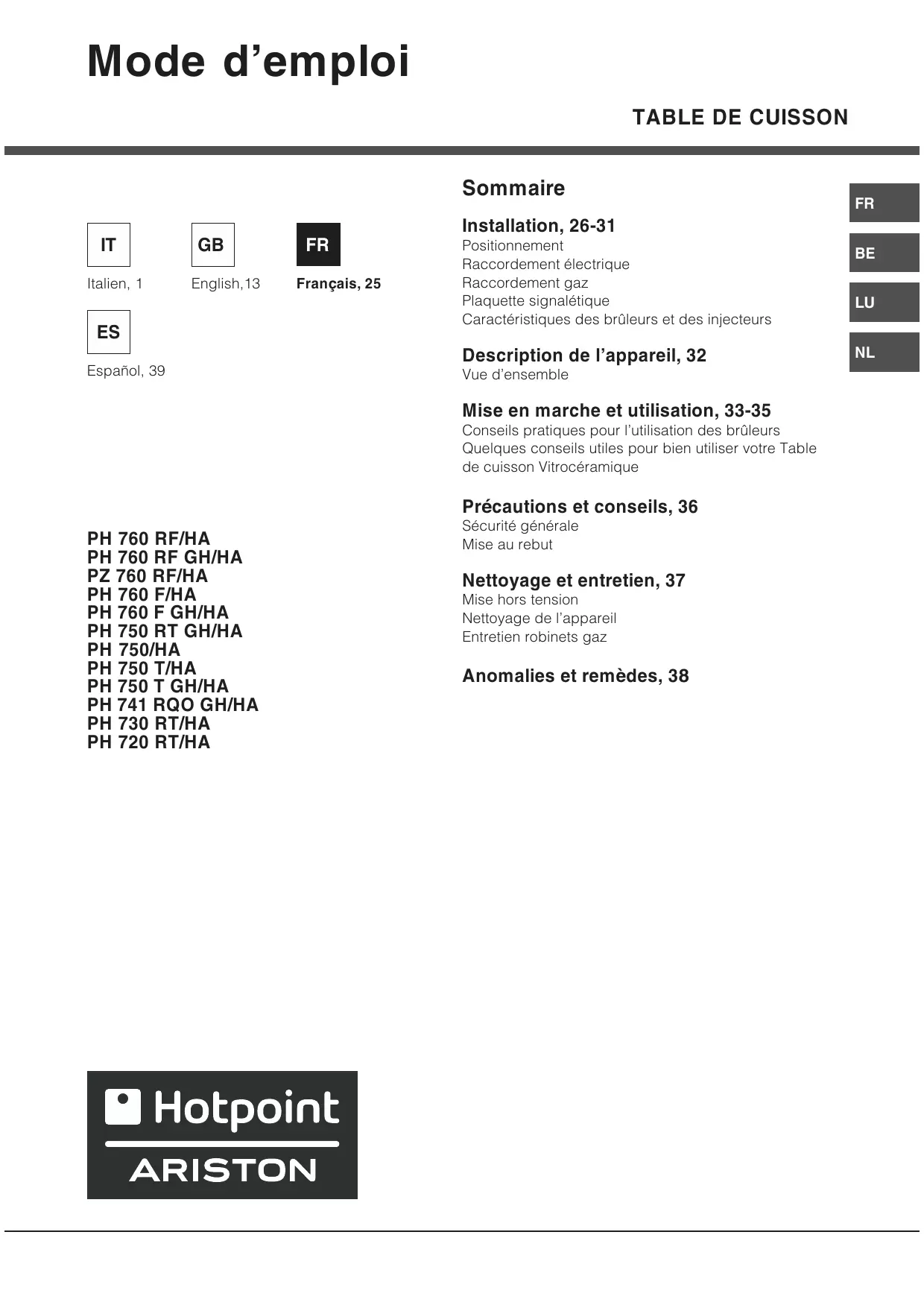 PH 741 RQO - Table de cuisson HOTPOINT-ARISTON - Notice d'utilisation et mode d'emploi gratuit