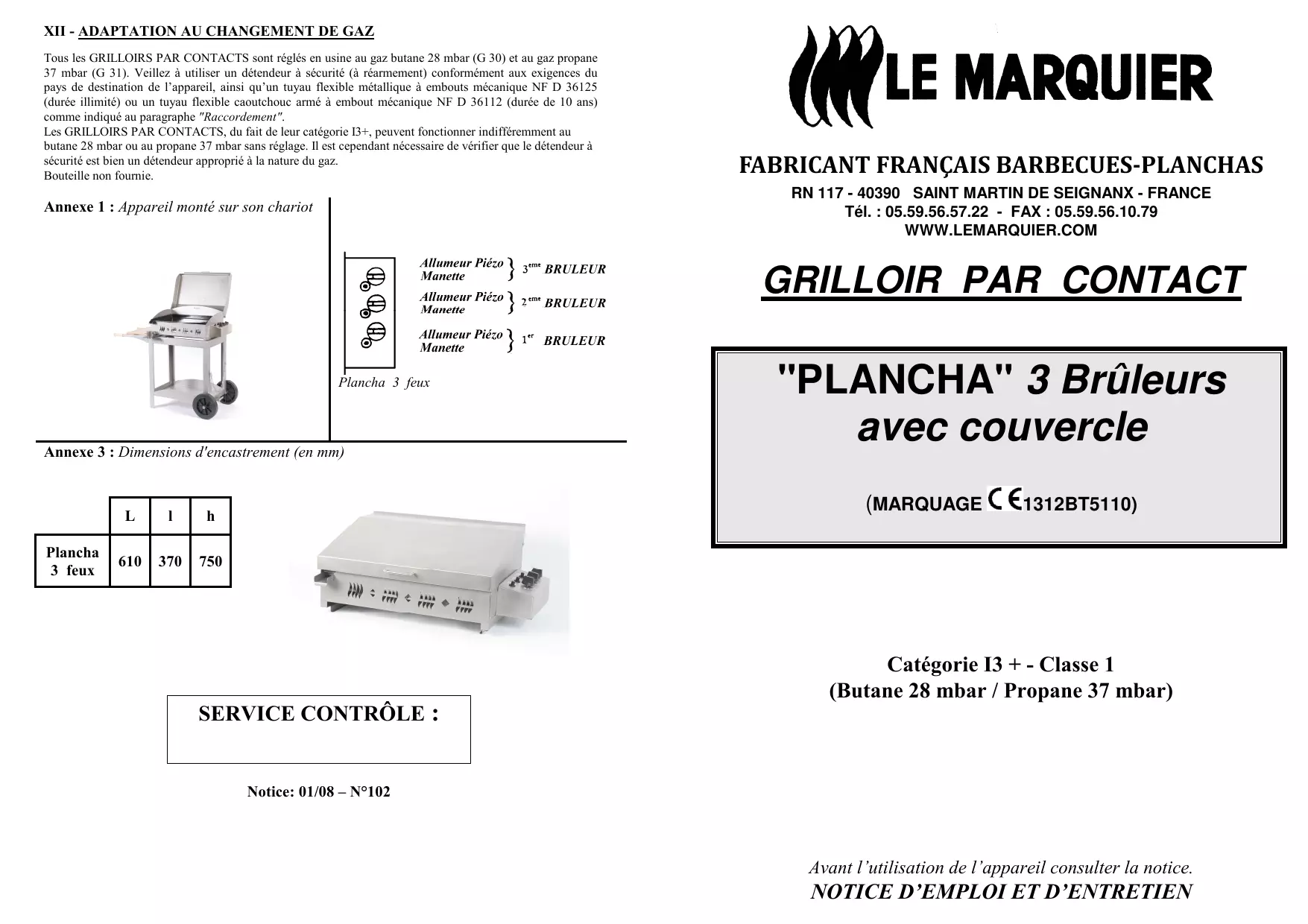 Les GRILLOIRS PAR CONTACTS, du fait de leur catégorie, peuvent fonctionner indifféremment au butane 28 mbar ou au propane 37 mbar sans réglage. Il est cependant nécessaire de vérifier que le détendeur à sécurité est bien un détendeur approprié à la nature du gaz.
