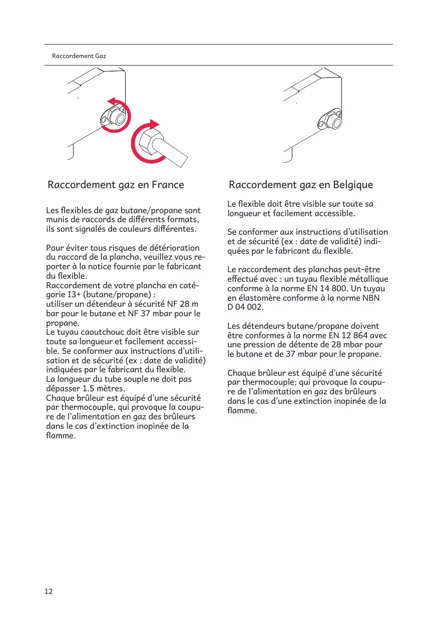 Raccordement gaz en Belgique Le flexible doit être visible sur toute sa longueur et facilement accessible. Se conformer aux instructions d’utilisation et de sécurité (ex : date de validité) indiquées par le fabricant du flexible. Le raccordement des planchas peut-être effectué avec : un tuyau flexible métallique conforme à la norme EN 14 800. Un tuyau en élastomère conforme à la norme NBN D 04 002. Les détendeurs butane/propane doivent être conformes à la norme EN 12 864 avec une pression de détente de 28 mbar pour le butane et de 37 mbar pour le propane. Chaque brûleur est équipé d’une sécurité par thermocouple; qui provoque la coupure de l’alimentation en gaz des brûleurs dans le cas d’une extinction inopinée de la flamme.