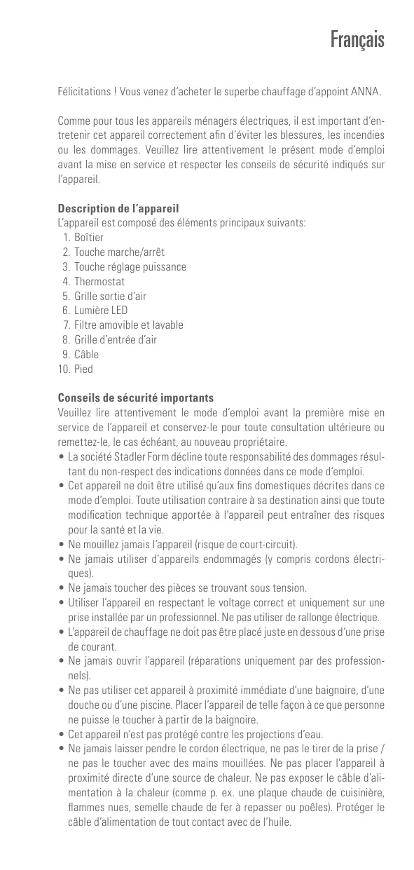Félicitations! Vous venez d'acheter le superbe chauffage d'appoint ANNA.