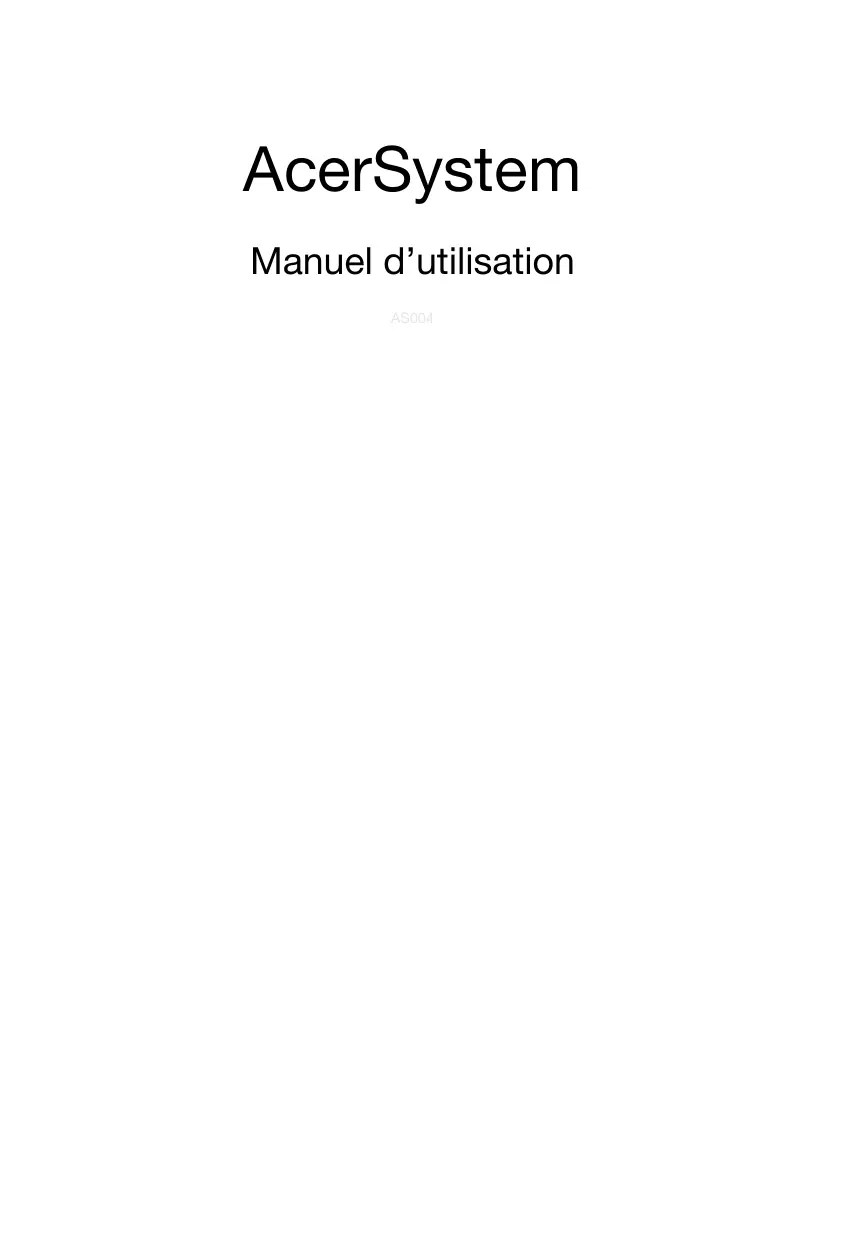 AcerSystem Manuel d’utilisation AS004 Copyright © 2012 Tous droits réservés AcerSystem Manuel d’utilisation Visitez http://registration.acer.com et découvrez les avantages réservés aux clients Acer. iii Informations pour votre sécurité et votre confort Consignes de sécurité Lisez ces instructions avec attention. Conservez ce document pour des références futures. Conformez-vous aux consignes et avertissements indiqués sur cet appareil. Mise hors tension de l’appareil avant le nettoyage Débranchez l’alimentation secteur avant tout nettoyage. N’utilisez pas de liquide ou d’aérosol de nettoyage. Utilisez un chiffon, légèrement humecté d’eau pour le nettoyage. Avertissements