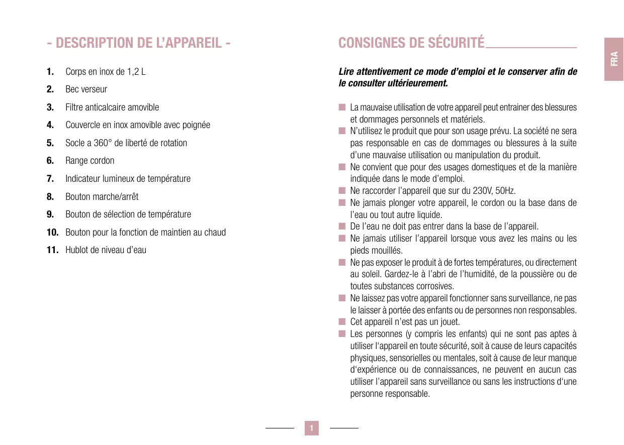 ■■ Si votre appareil est endommagé, ne pas tenter de le réparer vous-même. Toute modification ou réparation non autorisée faite sur l’appareil, entraine l’annulation de la garantie. ■■ Pour votre sécurité, n’utilisez que des accessoires et pièces détachées adaptés à votre appareil. CARACTéRISTIQUES TECHNIQUES ■■ Corps en inox poli ■■ Contenance 1,2 L ■■ Filtre anticalcaire ■■ Bouton de déverrouillage du couvercle ■■ Couvercle ■■ 4 indicateurs de température (40°C, 60°C, 80°C, 100°C) ■■ Bouton de sélection de température ■■ Bouton de maintien au chaud ■■ Bouton marche/arrêt ■■ Hublot de niveau d’eau ■■ Dispositif anti-ébullition à sec CORDON Il faut examiner attentivement le câble d’alimentation avant toute utilisation. Si celui-ci est endommagé, il ne faut pas utiliser l’appareil. Le cordon ne doit être remplacé que par , son service après vente ou une personne qualifiée et agréée par et ce afin d’éviter un danger pour l’usager. Le cordon utilisé est un HO5VV-F 3 G 0,75 mm².