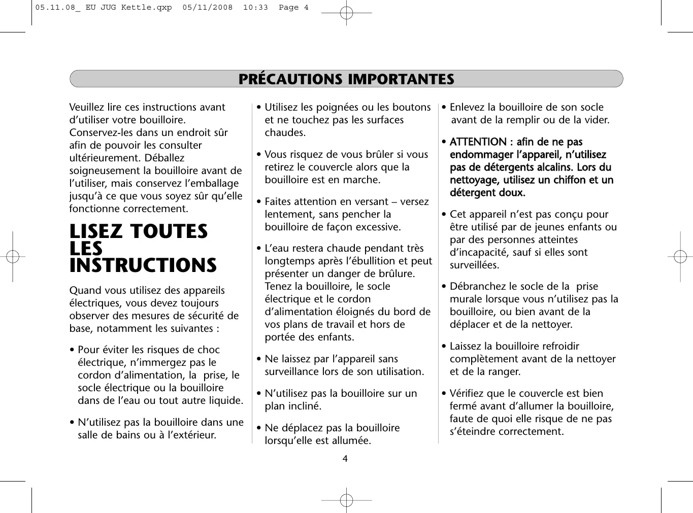 Veuillez lire ces instructions avant d’utiliser votre bouilloire. Conservez-les dans un endroit sûr afin de pouvoir les consulter ultérieurement. Déballez soigneusement la bouilloire avant de l’utiliser, mais conservez l’emballage jusqu’à ce que vous soyez sûr qu’elle fonctionne correctement. LISEZ TOUTES LES INSTRUCTIONS Quand vous utilisez des appareils électriques, vous devez toujours observer des mesures de sécurité de base, notamment les suivantes :