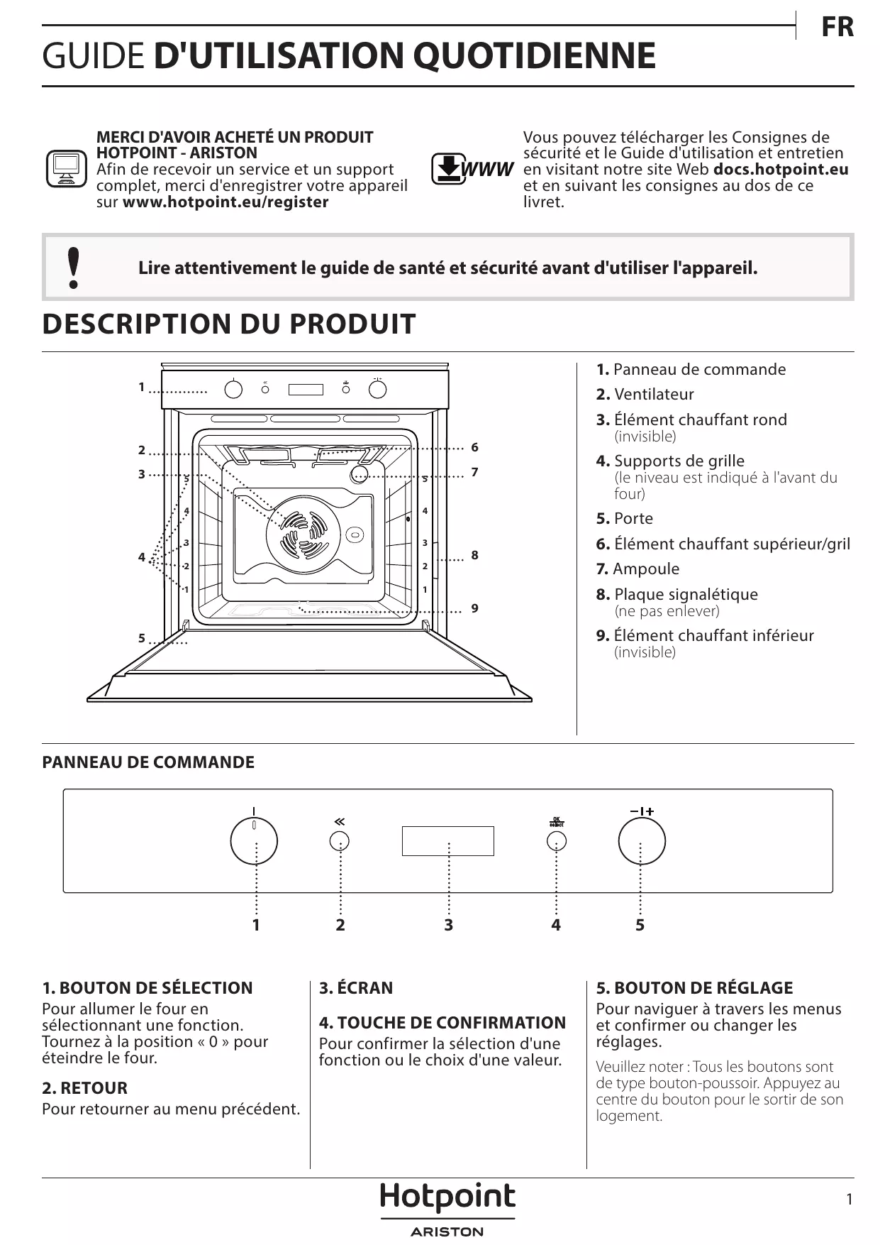 Vous pouvez télécharger les Consignes de sécurité et le Guide d'utilisation et entretien en visitant notre site Web docs.hotpoint.eu et en suivant les consignes au dos de ce livret.