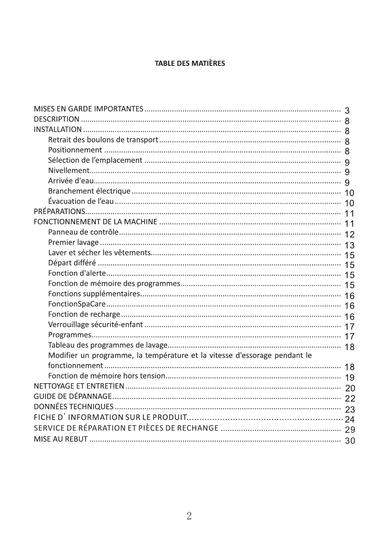 Fonctions principales Départ différé, contrôle de la mousse, sécurité enfants