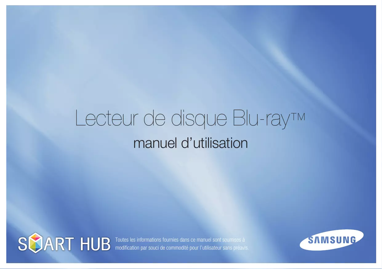 • Samsung ne peut assurer que ce produit pourra lire tous les disques portant les logos BD-ROM, BD-RE/-R, DVD-VIDEO, DVD-RW/-R, DVD+RW/+R et CD-RW/-R. Par ailleurs, il est possible que cet appareil ne réponde pas à toutes les commandes ou ne puisse effectuer toutes les fonctions de tous les disques. Ces problèmes, ainsi que d’autres problèmes liés à la compatibilité et au fonctionnement de l’appareil avec des formats nouveaux ou des formats déjà existants sont possibles pour les raisons suivantes : - le format Blu-ray est nouveau et en constante évolution. Il est possible que cet appareil ne puisse pas exploiter toutes les fonctions des disques Blu-ray car certaines fonctionnalités peuvent être optionnelles, des caractéristiques supplémentaires peuvent avoir été ajoutées au format Blu-ray après la fabrication de l’appareil et la disponibilité de certaines fonctions peut être repoussée ; - toutes les versions des formats de disque existantes et nouvelles ne sont pas prises en charge par cet appareil ; - les formats de disque existants et nouveaux peuvent être révisés, modifiés, mis à jour, améliorés et/ou complétés ; - certains disques sont fabriqués de manière à restreindre le fonctionnement ou à n’autoriser que certaines fonctions lors de la lecture ; - certaines fonctions peuvent être facultatives, avoir été ajoutées après la fabrication de l’appareil ou soumises à un délai de disponibilité ; - certains disques portant les logos BD-ROM, BD-RE/-R, DVD-VIDEO, DVD-RW/-R, DVD+RW/+R et CD-RW/-R peuvent néanmoins être non conformes ; - certains disques seront impossibles à lire en raison de leur état ou des conditions d’enregistrement ; - des problèmes et des erreurs peuvent survenir lors de la création des logiciels Blu-ray ou DVD et/ou lors de la fabrication des disques ; - cet appareil fonctionne différemment d’un lecteur DVD classique ou de tout autre équipement audiovisuel ; - pour des raisons mentionnées tout au long de ce manuel d’utilisation et pour d’autres raisons découvertes et diffusées par le service après-vente de SAMSUNG. • Si vous rencontrez des problèmes liés à la compatibilité des disques ou au fonctionnement de l’appareil, contactez le service après-vente de SAMSUNG. Vous pouvez également contacter le service après-vente SAMSUNG au sujet des mises à jour possibles de cet appareil. • Pour de plus amples informations sur les restrictions de lecture et sur la compatibilité des disques, reportezvous aux sections suivantes de ce manuel d’utilisation : Précautions, Avant de lire le manuel d’utilisation, Types et caractéristiques de disque et Avant la lecture.
