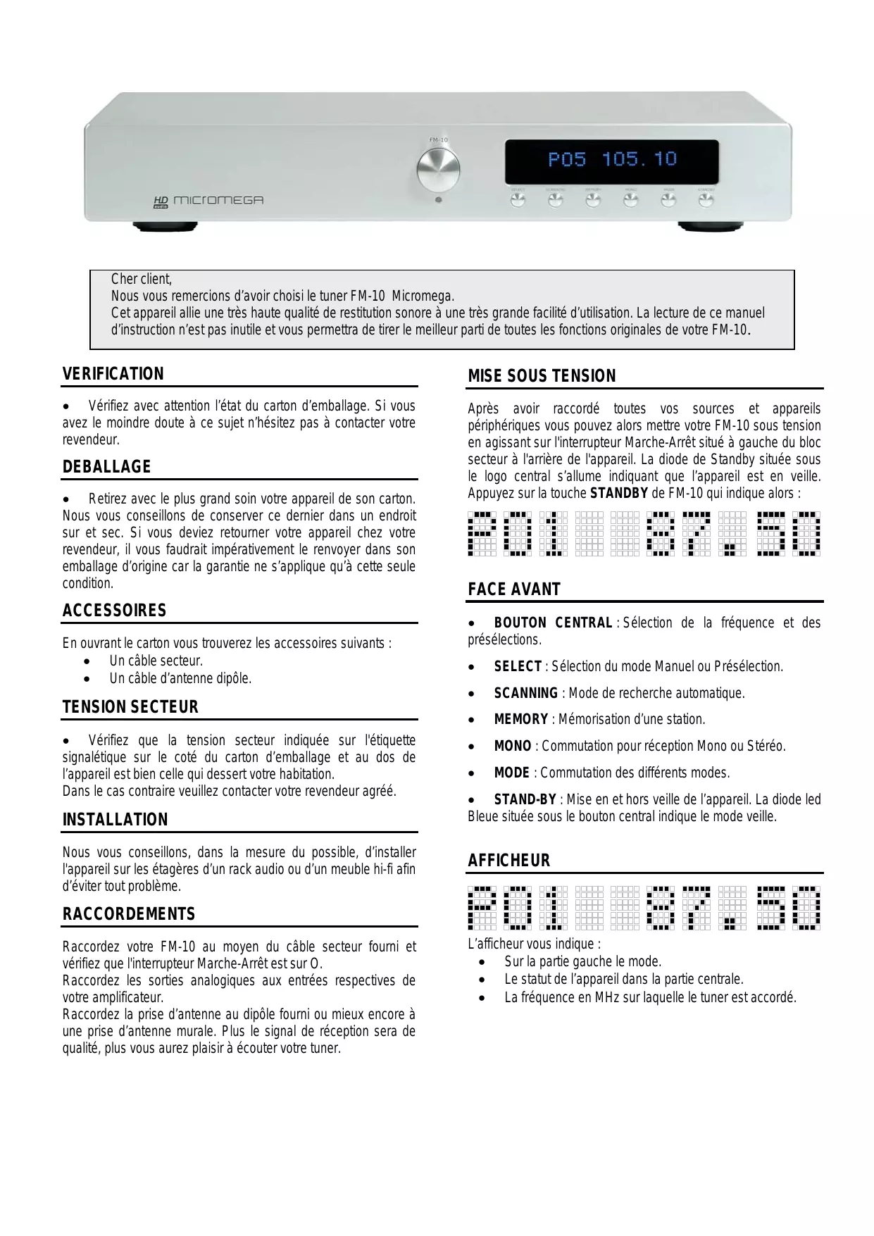 NOTICE D'UTILISATION FM-10 Cher client, Nous vous remercions d’avoir choisi le tuner FM-10 Micromega. Cet appareil allie une très haute qualité de restitution sonore à une très grande facilité d’utilisation. La lecture de ce manuel d’instruction n’est pas inutile et vous permettra de tirer le meilleur parti de toutes les fonctions originales de votre FM-10. VERIFICATION