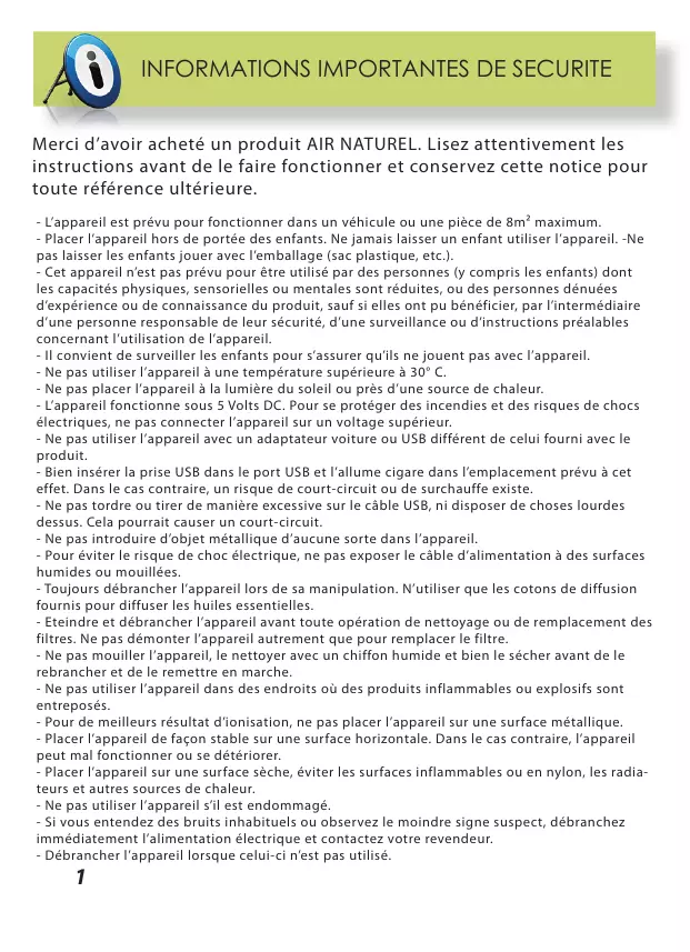 Merci d’avoir acheté un produit AIR NATUREL. Lisez attentivement les instructions avant de le faire fonctionner et conservez cette notice pour toute référence ultérieure. - L’appareil est prévu pour fonctionner dans un véhicule ou une pièce de 8m² maximum. - Placer l’appareil hors de portée des enfants. Ne jamais laisser un enfant utiliser l’appareil. -Ne pas laisser les enfants jouer avec l’emballage (sac plastique, etc.). - Cet appareil n’est pas prévu pour être utilisé par des personnes (y compris les enfants) dont les capacités physiques, sensorielles ou mentales sont réduites, ou des personnes dénuées d’expérience ou de connaissance du produit, sauf si elles ont pu bénéficier, par l’intermédiaire d’une personne responsable de leur sécurité, d’une surveillance ou d’instructions préalables concernant l’utilisation de l’appareil. - Il convient de surveiller les enfants pour s’assurer qu’ils ne jouent pas avec l’appareil. - Ne pas utiliser l’appareil à une température supérieure à 30° C. - Ne pas placer l’appareil à la lumière du soleil ou près d’une source de chaleur. - L’appareil fonctionne sous 5 Volts DC. Pour se protéger des incendies et des risques de chocs électriques, ne pas connecter l’appareil sur un voltage supérieur. - Ne pas utiliser l’appareil avec un adaptateur voiture ou USB différent de celui fourni avec le produit. - Bien insérer la prise USB dans le port USB et l’allume cigare dans l’emplacement prévu à cet effet. Dans le cas contraire, un risque de court-circuit ou de surchauffe existe. - Ne pas tordre ou tirer de manière excessive sur le câble USB, ni disposer de choses lourdes dessus. Cela pourrait causer un court-circuit. - Ne pas introduire d’objet métallique d’aucune sorte dans l’appareil. - Pour éviter le risque de choc électrique, ne pas exposer le câble d’alimentation à des surfaces humides ou mouillées. - Toujours débrancher l’appareil lors de sa manipulation. N’utiliser que les cotons de diffusion fournis pour diffuser les huiles essentielles. - Eteindre et débrancher l’appareil avant toute opération de nettoyage ou de remplacement des filtres. Ne pas démonter l’appareil autrement que pour remplacer le filtre. - Ne pas mouiller l’appareil, le nettoyer avec un chiffon humide et bien le sécher avant de le rebrancher et de le remettre en marche. - Ne pas utiliser l’appareil dans des endroits où des produits inflammables ou explosifs sont entreposés. - Pour de meilleurs résultat d’ionisation, ne pas placer l’appareil sur une surface métallique. - Placer l’appareil de façon stable sur une surface horizontale. Dans le cas contraire, l’appareil peut mal fonctionner ou se détériorer. - Placer l’appareil sur une surface sèche, éviter les surfaces inflammables ou en nylon, les radiateurs et autres sources de chaleur. - Ne pas utiliser l’appareil s’il est endommagé. - Si vous entendez des bruits inhabituels ou observez le moindre signe suspect, débranchez immédiatement l’alimentation électrique et contactez votre revendeur. - Débrancher l’appareil lorsque celui-ci n’est pas utilisé.