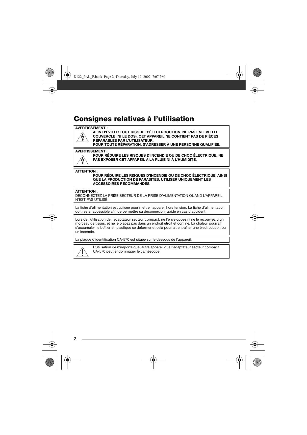 POUR RÉDUIRE LES RISQUES D’INCENDIE OU DE CHOC ÉLECTRIQUE, NE PAS EXPOSER CET APPAREIL À LA PLUIE NI À L’HUMIDITÉ. ATTENTION : POUR RÉDUIRE LES RISQUES D’INCENDIE OU DE CHOC ÉLECTRIQUE, AINSI QUE LA PRODUCTION DE PARASITES, UTILISER UNIQUEMENT LES ACCESSOIRES RECOMMANDÉS. ATTENTION : DÉCONNECTEZ LA PRISE SECTEUR DE LA PRISE D’ALIMENTATION QUAND L’APPAREIL N’EST PAS UTILISÉ. La fiche d'alimentation est utilisée pour mettre l'appareil hors tension. La fiche d'alimentation doit rester accessible afin de permettre sa déconnexion rapide en cas d'accident. Lors de l’utilisation de l’adaptateur secteur compact, ne l’enveloppez ni ne le recouvrez d’un morceau de tissus, et ne le placez pas dans un endroit étroit et confiné. La chaleur pourrait s’accumuler, le boîtier en plastique se déformer et cela pourrait entraîner une électrocution ou un incendie. La plaque d’identification CA-570 est située sur le dessous de l’appareil. L’utilisation de n’importe quel autre appareil que l’adaptateur secteur compact CA-570 peut endommager le caméscope.