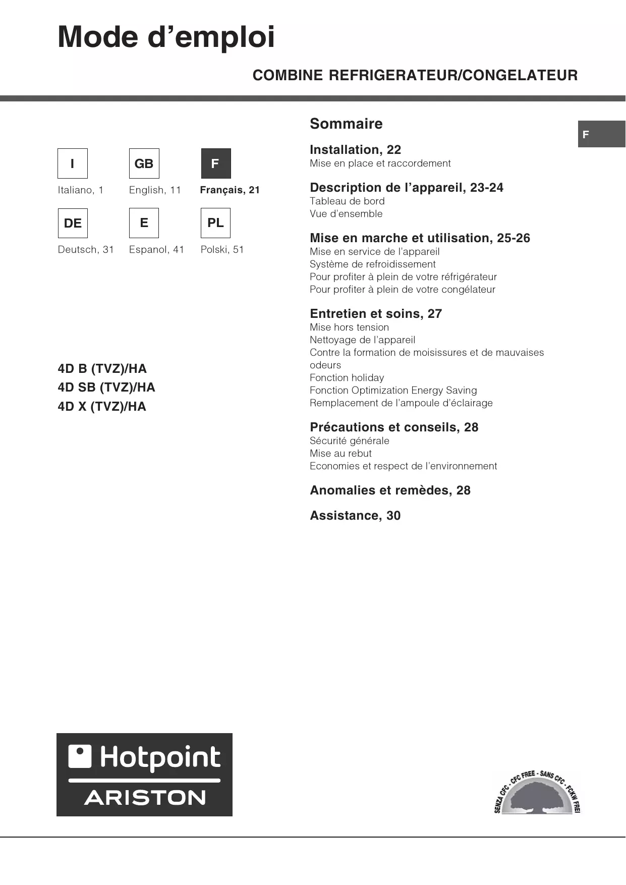 QUADRIO 4DXTVHA ARG - Réfrigérateur congélateur HOTPOINT ARISTON - Notice d'utilisation et mode d'emploi gratuit