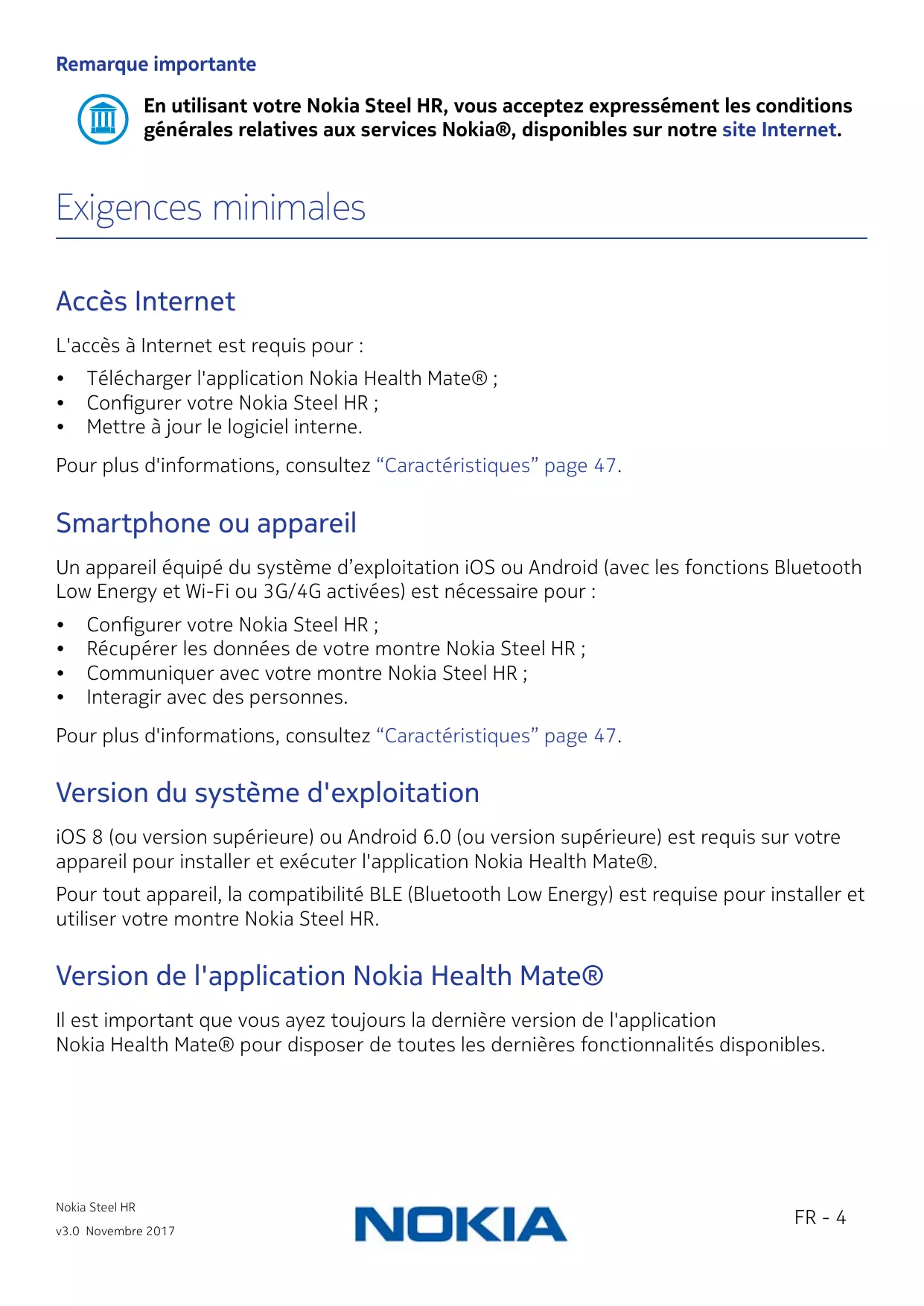 - Données personnelles 43 Instructions relatives à la sécurité Utilisation et rangement 45 Mesure de la fréquence cardiaque 45 Étanchéité 45 Entretien et réparation 46 Caractéristiques 47 Récapitulatif sur la publication du document49 Garantie50 Mentions légales51 Nokia Steel HR v3.0 Novembre 2017 FR - 3 Remarque importante En utilisant votre Nokia Steel HR, vous acceptez expressément les conditions générales relatives aux services Nokia®, disponibles sur notre site Internet. Exigences minimales Accès Internet L'accès à Internet est requis pour : p. 45